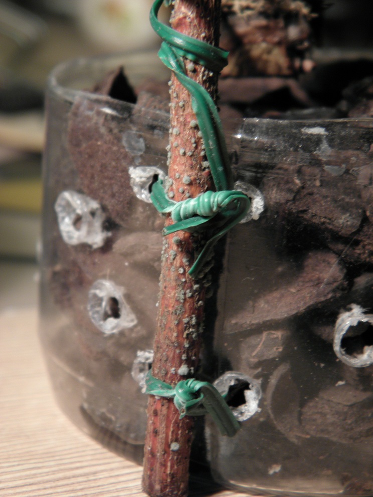- Następnie przygotowałem doniczkę z podporą, żeby zawiesić pacjenta (fot. 5). Pozwoli to na umieszczenie storczyka w doniczce i obłożenie podłożem bez większego ryzyka uszkodzenia resztek korzeni.