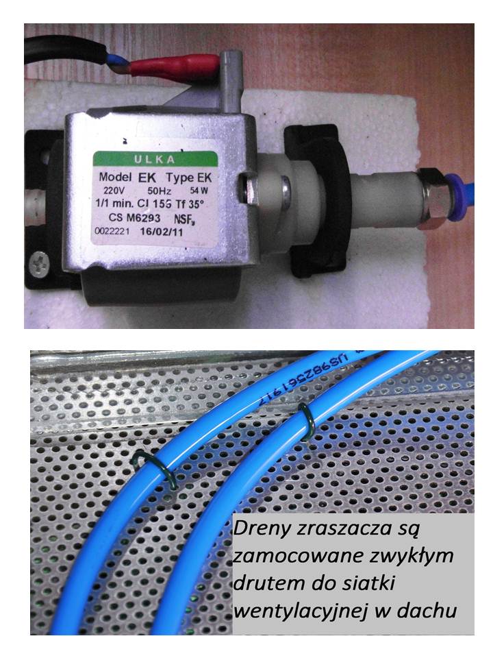 Dno orchidarium mam wyłożone 10 cm warstwą keramzytu zalanego wodą, na spodzie, na szkle gruba folia na 10 cm podniesiona na ścianki, jakby tak tfu, tfu…dodatkowo w lecie dwa razy na dobę pracuje zraszacz, zimą tylko rano. Zraszacz jest sterowany programatorem. Dzięki temu wilgotność latem utrzymuje się na poziomie 70-85 %, zimą 55- 70% Zraszacz jest zakupiony w jednym ze sklepów zoologicznych(gadygady-na wodzie destylowanej pracuje bez zarzutu, wszelkie kombinacje typu czajniki filtrujące odpadają, zatykają się dysze). Zraszacz celem wygłuszenia ma zamontowane uszczelki"wygłuszające" i jest przymocowany do płatu styropianu. Na zdjęciu poniżej pokazany model pompki(oby to nie była kryptoreklama, jakby co proszę nie zwracać uwagi na tabliczkę znamionową). Dreny zraszacza są zamontowane drucikami do siatki wentylacyjnej