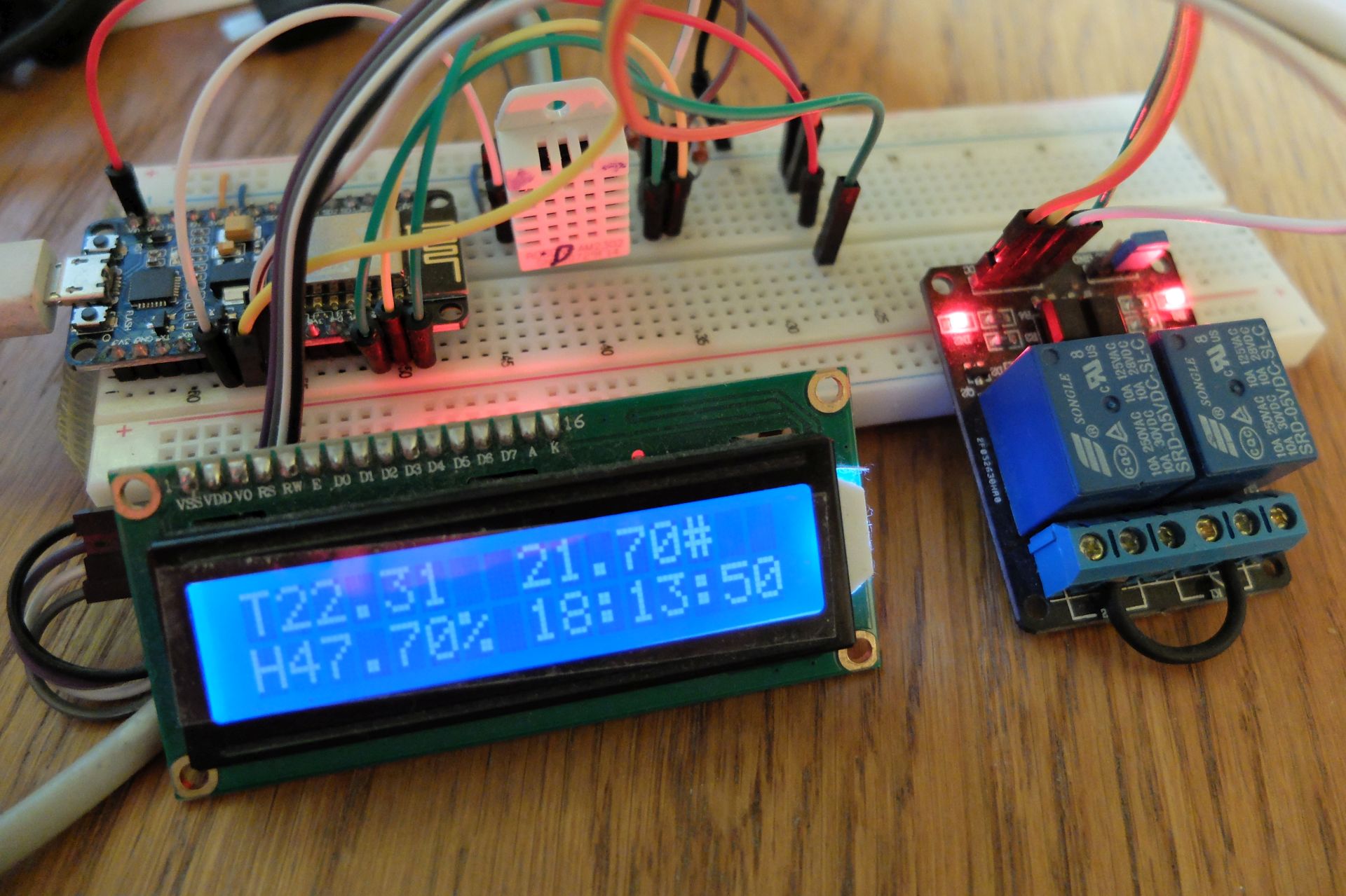 #include <ESP8266WiFi.h>#include <ESP8266WiFiMulti.h>#include <WiFiUdp.h>#include <TimeLib.h>#include <Timezone.h>#include <Ticker.h>#include <EEPROM.h>#include <Wire.h>#include <SimpleDHT.h>#include <LiquidCrystal_PCF8574.h>#include <OneWire.h>#include <DallasTemperature.h>#define ONE_WIRE_BUS 13 // ( 12E - D7)#define DHT22_BUS 16#define GRZANIE 12 // ( 12E - D6)#define SWIATLO 14 // ( 12E - D5)#define GRZANIE_ON digitalWrite(GRZANIE, LOW)#define GRZANIE_OFF digitalWrite(GRZANIE, HIGH)#define SWIATLO_ON digitalWrite(SWIATLO, LOW)#define SWIATLO_OFF digitalWrite(SWIATLO, HIGH)#define LED 2 //12e - D4,#define LED_ON digitalWrite(LED, LOW)#define LED_OFF digitalWrite(LED, HIGH)LiquidCrystal_PCF8574 lcd(0x27); // set the LCD address to 0x27 for a 16 chars and 2 line displayTimeElements t;Ticker zegar;int czasSynchronizowany;bool czasWyswietlony;String help = "<p>Akceptowane komendy</p>td - temperatura dzien [0-40]<br>tn - temperatura noc [0-40]<br>hd - godzina DZIEN [0-23]<br>hn - godzina NOC [0-23]<br>hi - histereza [1-10]<br>tt - wybor termmometru [0-1]";ESP8266WiFiMulti wifiMulti; // Create an instance of the ESP8266WiFiMulti class, called 'wifiMulti'WiFiUDP UDP; // Create an instance of the WiFiUDP class to send and receiveIPAddress timeServerIP; // time.nist.gov NTP server addressconst char* NTPServerName = "0.pl.pool.ntp.org";const int NTP_PACKET_SIZE = 48; // NTP time stamp is in the first 48 bytes of the messagebyte NTPBuffer[NTP_PACKET_SIZE]; // buffer to hold incoming and outgoing packetsSimpleDHT22 dht22;OneWire oneWire(ONE_WIRE_BUS);DallasTemperature sensors(&oneWire);// adresy komorek EEPROM #define TD_ADDR 0 // temperatura dzien#define TN_ADDR 1 // temperatura noc#define H_ADDR 2 // histereza temperaturya termostatu#define HD_ADDR 3 // godzina DZIEN#define HN_ADDR 4 // godzina NOC#define T_ADDR 5 // wybor czujnika termostatu: 0= DHT22, 1=DS10b20// Create an instance of the server// specify the port to listen on as an argumentWiFiServer serverWWW(80);void setup() { int error; float temperature = 0; float humidity = 0; EEPROM.begin(512); Serial.begin(115200); Wire.begin(); Wire.beginTransmission(0x27); error = Wire.endTransmission(); error ? Serial.println(": LCD not found.") : Serial.println(": LCD found."); lcd.begin(16, 2); // initialize the lcd sensors.begin(); sensors.setResolution(12); if ( (error = dht22.read2(DHT22_BUS, &temperature, &humidity, NULL) ) != SimpleDHTErrSuccess) Serial.print("Read DHT22 failed, error="); Serial.println(error);delay(2000); startWiFi(); // Try to connect to some given access points. Then wait for a connection startUDP(); ustawCzas(); zegar.attach_ms(1000, OneSekInterrupt); serverWWW.begin(); Serial.println("Server WWW started"); pinMode(GRZANIE, OUTPUT); pinMode(SWIATLO, OUTPUT); GRZANIE_OFF; SWIATLO_OFF; }void loop() { float tempC; float temperature; float humidity; float temperatura[2]; if( ( (t.Second % 5) == 0) && (czasWyswietlony==false) ) { if (czasSynchronizowany == 0) ustawCzas(); czasWyswietlony=true; sensors.requestTemperatures(); tempC = sensors.getTempCByIndex(0); dht22.read2(DHT22_BUS, &temperature, &humidity, NULL); temperatura[0]=temperature; temperatura[1]=tempC; lcd.setBacklight(255); lcd.home(); lcd.clear(); lcd.print("T"); lcd.print(temperatura[1]); if( EEPROM.read(T_ADDR) == 0 ) lcd.print("#"); lcd.setCursor(8, 0); lcd.print(temperatura[0]); if( EEPROM.read(T_ADDR) == 1 ) lcd.print("#"); lcd.setCursor(0, 1); lcd.print("H"); lcd.print(humidity); lcd.print("%"); lcd.setCursor(8, 1); if(t.Hour < 10) lcd.print('0'); lcd.print(t.Hour); lcd.print(":"); if(t.Minute < 10) lcd.print('0'); lcd.print(t.Minute); lcd.print(":"); if(t.Second < 10) lcd.print('0'); lcd.print(t.Second); Serial.println(""); Serial.print(t.Hour); Serial.print(":"); Serial.print(t.Minute); Serial.print(":"); Serial.println(t.Second); Serial.print("Temperatura DHT22: "); if( EEPROM.read(T_ADDR) == 0 ) Serial.print("#"); Serial.print(temperatura[0]); Serial.print(" *C "); Serial.print(humidity); Serial.println(" %RH"); Serial.print("Temperatura DS18b20: "); if( EEPROM.read(T_ADDR) == 1 ) Serial.print("#"); Serial.print(temperatura[1]); Serial.println(" *C, "); Serial.print("\nStan termostatu: GRZANIE: "); digitalRead(GRZANIE) ? Serial.print("OFF") : Serial.print("ON"); Serial.print( " SWIATLO: "); digitalRead(SWIATLO) ? Serial.print("OFF") : Serial.print("ON"); } if( (t.Second % 5) != 0) czasWyswietlony=false; if( (t.Hour >= EEPROM.read(HD_ADDR) ) && (t.Hour < EEPROM.read(HN_ADDR) ) ) { // dzien SWIATLO_ON; if( temperatura[EEPROM.read(T_ADDR)] < ( EEPROM.read(TD_ADDR) - EEPROM.read(H_ADDR)) ) { GRZANIE_ON; } if( temperatura[EEPROM.read(T_ADDR)] > ( EEPROM.read(TD_ADDR) + EEPROM.read(H_ADDR)) ) { GRZANIE_OFF; } } else { // noc SWIATLO_OFF; if( temperatura[EEPROM.read(T_ADDR)] < ( EEPROM.read(TN_ADDR) - EEPROM.read(H_ADDR)) ) { GRZANIE_ON; } if( temperatura[EEPROM.read(T_ADDR)] > ( EEPROM.read(TN_ADDR) + EEPROM.read(H_ADDR)) ) { GRZANIE_OFF; } } // Check if a client has connected WiFiClient client = serverWWW.available(); if (!client) { return; } // Wait until the client sends some data Serial.println("new client"); while (!client.available()) { delay(1); } // Read the first line of the request String req = client.readStringUntil('\r'); Serial.println(req); client.flush(); String temp; int pos; int tempInt; bool pomoc; if ( ( pos = req.indexOf("td") ) != -1){ temp=req.substring(pos+2); tempInt = temp.toInt(); if ( (tempInt>=0) && (tempInt<=40) ) EEPROM.write(TD_ADDR, tempInt); EEPROM.commit(); } if ( ( pos = req.indexOf("tn") ) != -1){ temp=req.substring(pos+2); tempInt = temp.toInt(); if ( (tempInt>=0) && (tempInt<=40) ) EEPROM.write(TN_ADDR, tempInt); EEPROM.commit(); } if ( ( pos = req.indexOf("hd") ) != -1){ temp=req.substring(pos+2); tempInt = temp.toInt(); if ( (tempInt>=0) && (tempInt<24) ) EEPROM.write(HD_ADDR, tempInt); EEPROM.commit(); } if ( ( pos = req.indexOf("hn") ) != -1){ temp=req.substring(pos+2); tempInt = temp.toInt(); if ( (tempInt>=0) && (tem