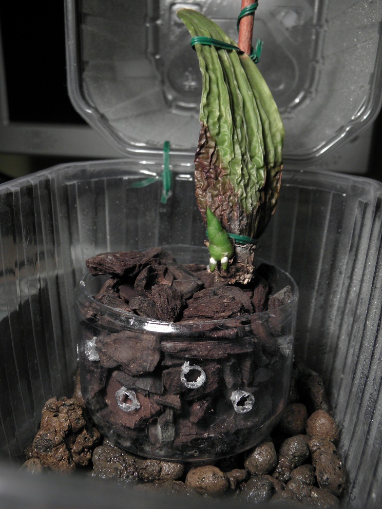 Mech jest tylko na powierzchni, był dodany już po przesadzeniu rośliny po sugestii Krzysztofa. Wyjściowo roślina była posadzona w podłożu zakupionym, składającym się głównie z włókien kokosowych, granulacja taka jak widać na zdjęciu 2011_12_11_2. Po sugestii Krzysztofa jedynie zdjąłem około 1cm górnej warstwy i poukładałem mech. Uwaga dotycząca ilości światła i temperatury skłoniła mnie do skonstruowania oświetlenia i tego całego inkubatora. W ogóle wszystkie sugestie były pomocne, jak na przykład ta żeby nie ruszać niepotrzebnie rośliną, bo gdy mało korzeni to cała roślina się przemieszcza i może dojść do uszkodzenia czubków delikatnych korzeni. Niestety nie doceniłem grzybów i nie przyłożyłem się odpowiednio do tego co radziła Mery. Jedynie raz opryskałem i podlałem roztworem Previcur. Zainfekowane stare liście już wtedy zaczynały żółknąc i po kilku dniach odpadły, więc stwierdziłem, że problem się skończył. Niestety odrodził się na tych najmłodszych liściach.