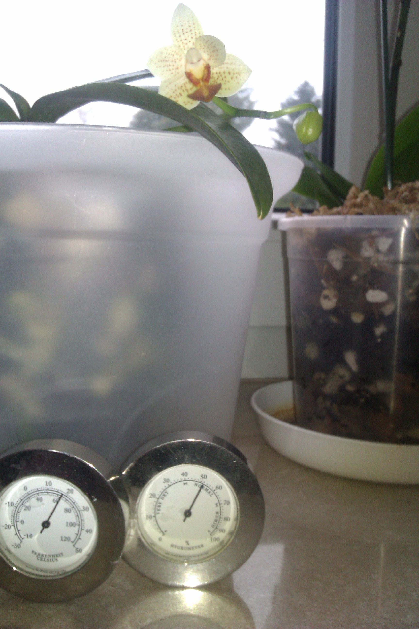 Ale już zastosowanie wysokich, zaznaczam wysokich, wysokość ścianki np 15 cm pojemników szklanych, czy plastikowych jest w stanie wygenerować lepsze wskazania, do tego kilka kilogramów keramzytu zalanych nie szklanką, ale kilkoma litrami wody, mam na myśli naprawdę duże pojemniki i postawienie roślin na kratkach, sprawia, że mają mikroklimat, ale krawędź doniczki znajduje się w ograniczonej ścianką przestrzeni, poniżej niej, lub odrobinę nad nią, oczywiście w towarzystwie storczyków rosną inne rośliny, np paprotki...