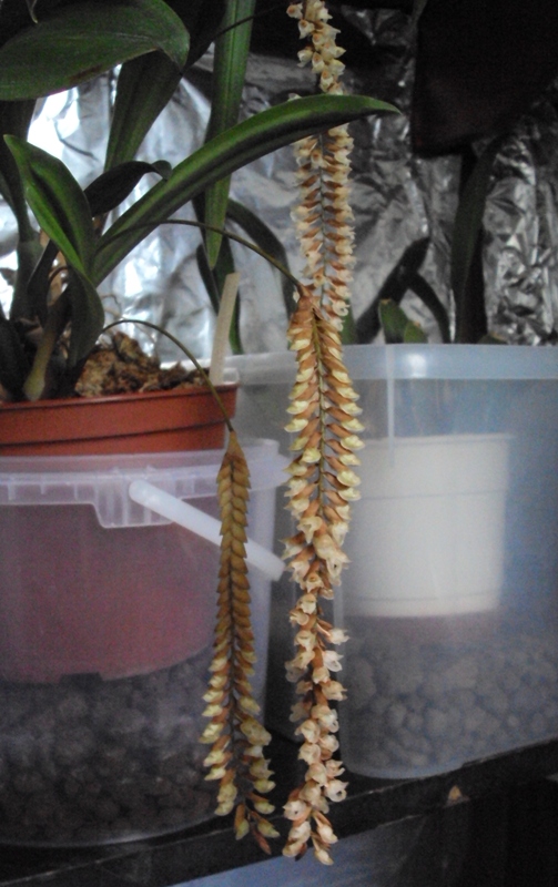 Wracając do wcześniejszego tematu chcę pokazać efekty czekania na rozwinięcie się kłosków. Zgodnie z podpowiedzią obłożyłam młode korzonki mchem sphagnum i dbałam o jego odpowiednia wilgotność. Choć roślina bardzo wyćwiczyła moją cierpliwość, to jednak w końcu otworzyła kwiaty. Drobne i maleńkie, ale wzruszają mnie swoją kruchością. Za to zrobić im dobre zdjęcia, to już potrzebny lepszy fotograf ode mnie. Zrobiłam co mogłam, lepszych nie będzie, bo aparat chyba znów pójdzie do naprawy. A szkoda bo chciałabym mieć je w lepszym wydaniu. Bardzo zależało mi na doprowadzeniu rośliny do kwitnienia, dedykuję je p. Janowi jako podziękowanie za szansę jaką otrzymałam. Jestem bardzo wdzięczna.