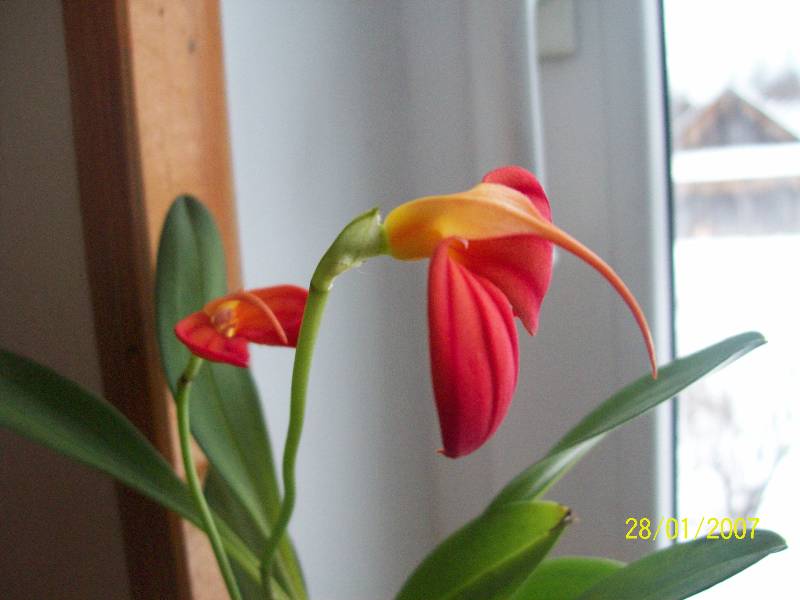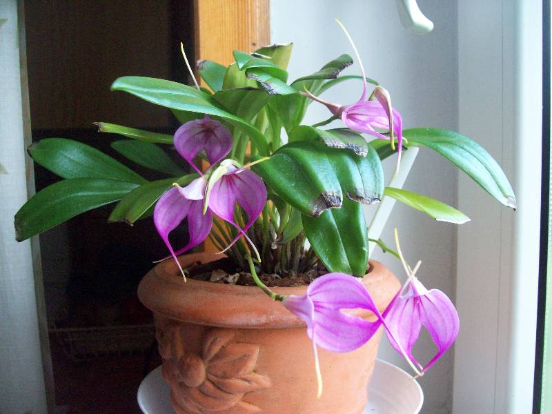 Na początku kwitła w okresie jesienno - zimowym.Po roku powtórzyła kwitnienie w tym czasie,a od wiosny kwitła jeszcze trzykrotnie.Przesadziłam ją do glinianej doniczki i zaraz zauważyłam,że listki jej się wyprostowały i wypuściła kilka nowych.Jednak masdevallie lubią gliniane doniczki.