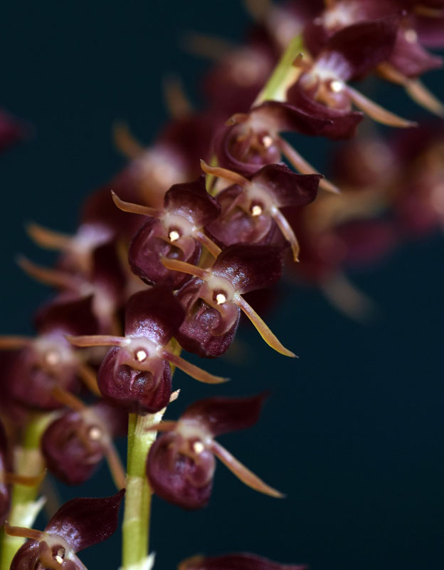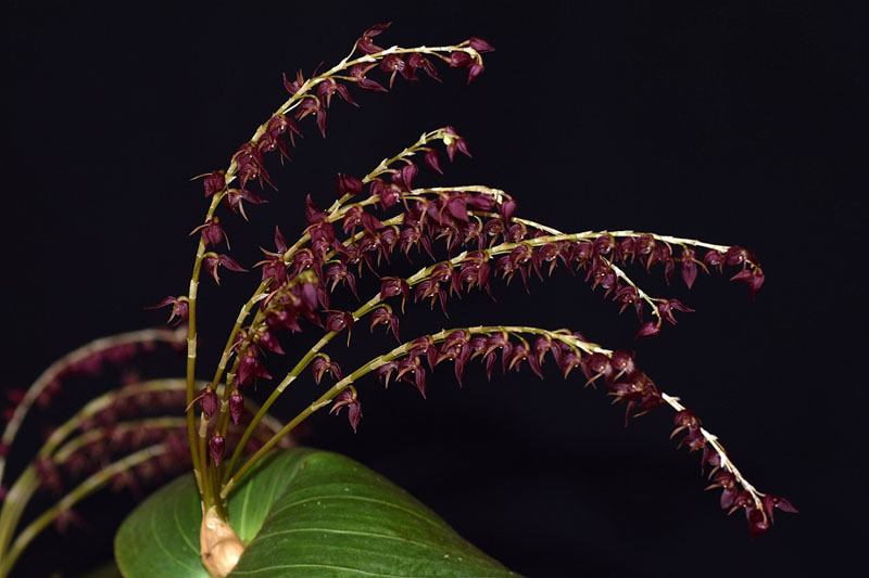 Kwitnie u mnie Pleurothallis manicosa, storczyk średniej wielkości, mój ma 30 cm. wysokości, największy liść 15cm. Uprawiam go chłodno w lodówce na napoje przerobionej na orchidarium.