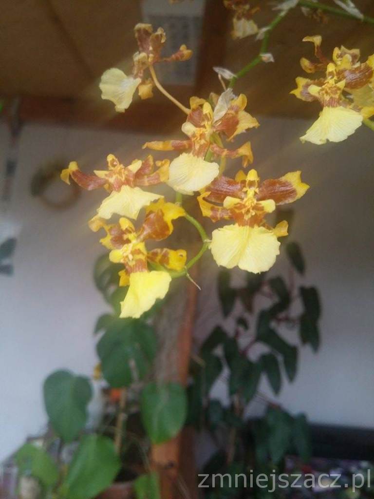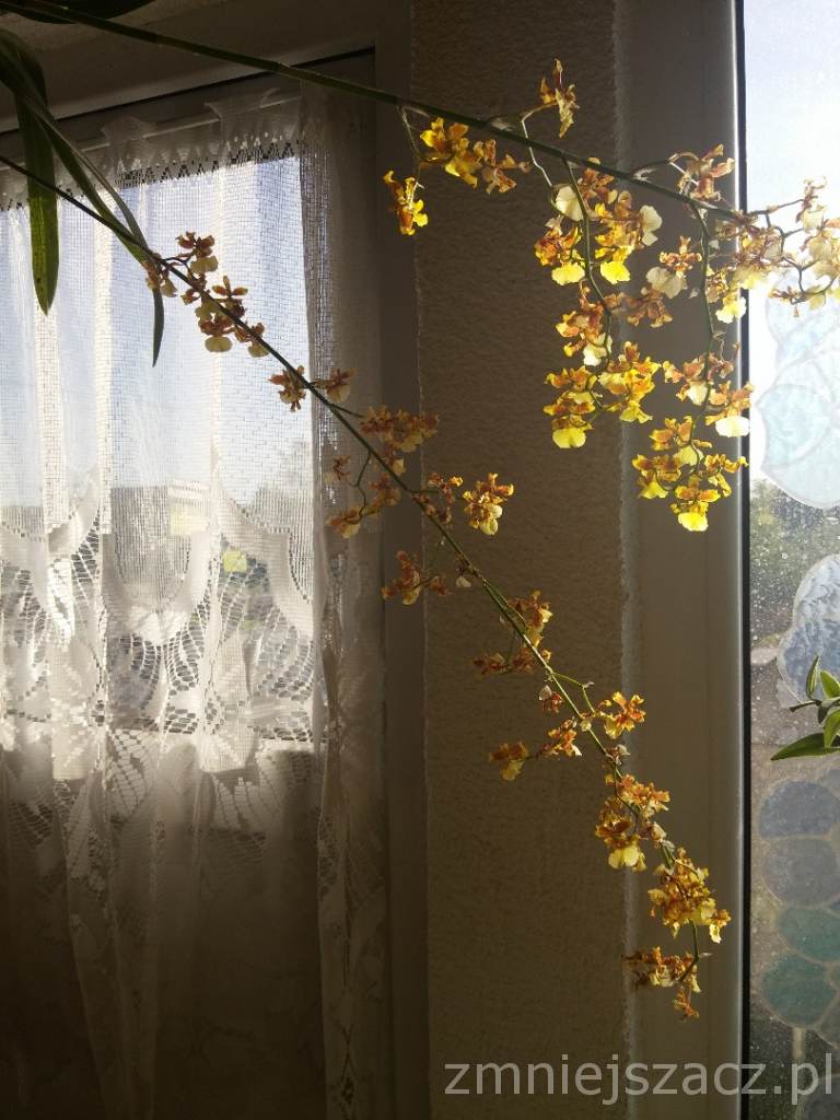 Niestety z braku czasu prezentowana dopiero teraz, roślina w zasadzie kończy już swoje kwitnienie. Trwało ono około miesiąca. Uprawiam oncidium w pobliżu zachodniego okna, w pomieszczeniu z dość sporymi różnicami temperatur pomiędzy dniem a nocą- altanka (20-30 st. w dzień i ok 17 st. noc) Rośnie w grubej korze, w plastikowej doniczce producenta. Jest u mnie dwa lata. W ubiegłym roku nie zakwitła z nowej pseudobulwy, w tym - na dwóch pędach. Jakość zdjęcia nieszczególna, robione telefonem.