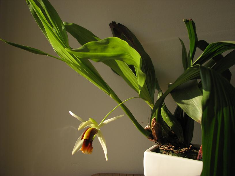 Trochę spóźnione zdjęcia z kwitnienia coelogyne usitana x lawrenceana. Kilka dni temu zakończyła kwitnienie, kwitła w sumie na czterech pędach, łącznie przez trzy miesiące, niestety momentu z największą jednocześnie liczbą kwiatów nie uwieczniłam. Coelogyne uprawiana na parapecie północnym. Pierwsze próby z uprawą w pobliżu nawilżacza skutkowały brązowymi plamami na liściach i pędem, który również zrobił się brązowy i uschnął. Teraz rośnie nad grzejnikiem w pomieszczeniu, gdzie nie ma nawilżacza, a wilgotność zimą woła o pomstę....a jednak zakwitła, i to na czterech pędach! Na zdjęciach pierwszy kwiat. Mam nadzieję, że komuś się spodoba