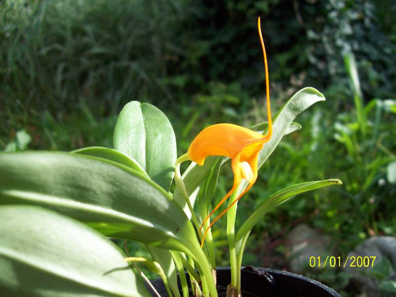 Ta Masdevallia podobała mi się zawsze - tubowaty kształt kwiatu,bardzo długie ogonki i ten kolor pomarańczy.W dodatku połysk.Tak.Wreszcie ją mam i mogę cieszyć oczy tym cudeńkiem.
