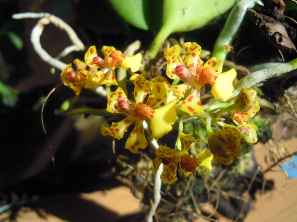 Myślę, że jest to Lophiaris nana (syn. Oncidium nanum). Roślinka jest mała, ciepłolubna, kwitnie jesienią, kwiatki bardzo podobne. Proszę pokazać całą roślinę.
