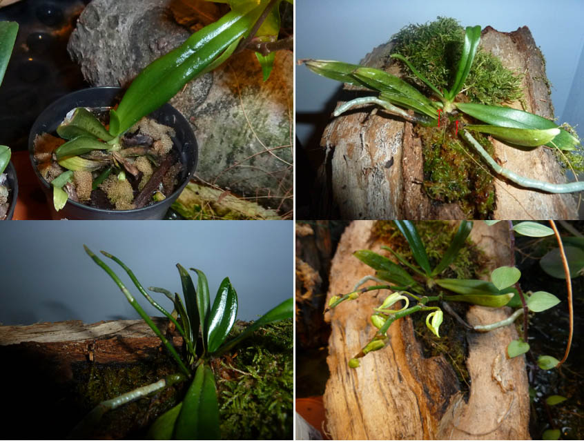Uprawiana była i jest w warunkach parapetowych tj. bez akwariów i tym podobnych pojemników. Początkowo rosła w doniczce z drobną korą (okresowo w pojemniku z orzecha kokosowego). Wzrastała bardzo powoli, prawie niezauważalnie. W maju ubiegłego roku przesadziłem ją na podkładkę z kawałka drewna cisa, w którym wydrążyłem zagłębienie. Korzenie obłożyłem sphagnum i częściowo zwykłym mchem, z kamieni znad strumienia. Podkładka miała stały kontakt z wodą zalegającą folię jaką wymoszczona jest powierzchnia mego ogródka. Temperatura D/N - 22-24 / 17-18 *C. wilgotność względna D/N 50-70/ 70-90 % ,półcień. Nawożenie sporadyczne Biohumusem. Tak zimą jak i latem przez okres około 1,5 m-ca pod podkładkę podstawiałem podstawkę, by ograniczyć dostęp wody - wymuszałem okres przesuszania rośliny. Zauważyłem, że po zmianie warunków uprawy storczyk jakby się obudził i przez pół roku przyrosły mu trzy liście, a na powierzchni pojawiły się dwa korzenie.