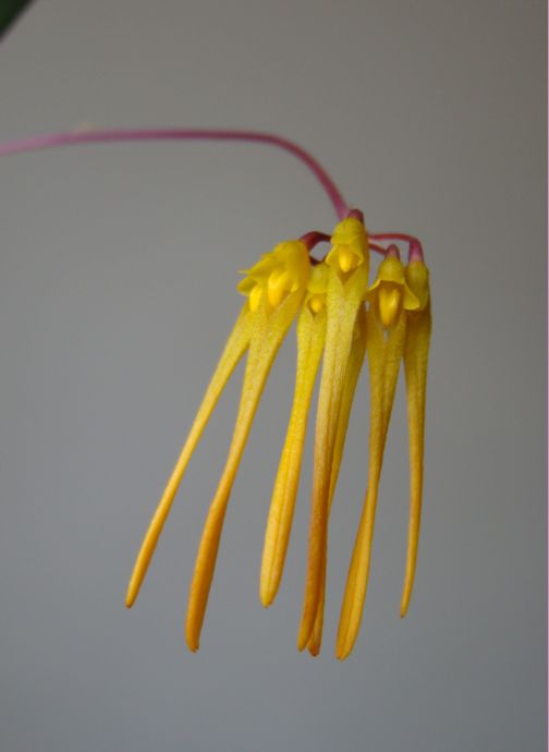 Bulbophyllum już przekwita. Stopniowo zmieniał się kolor kwiatów z żółtego na pomarańczowy.