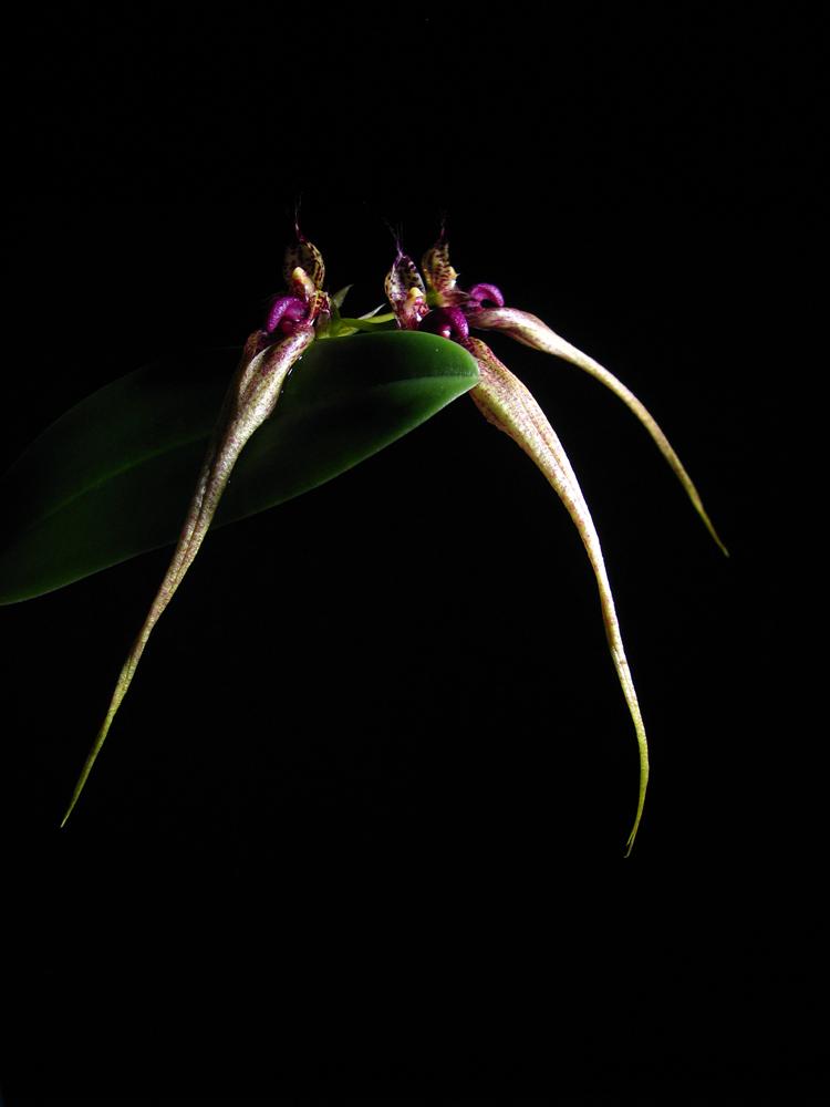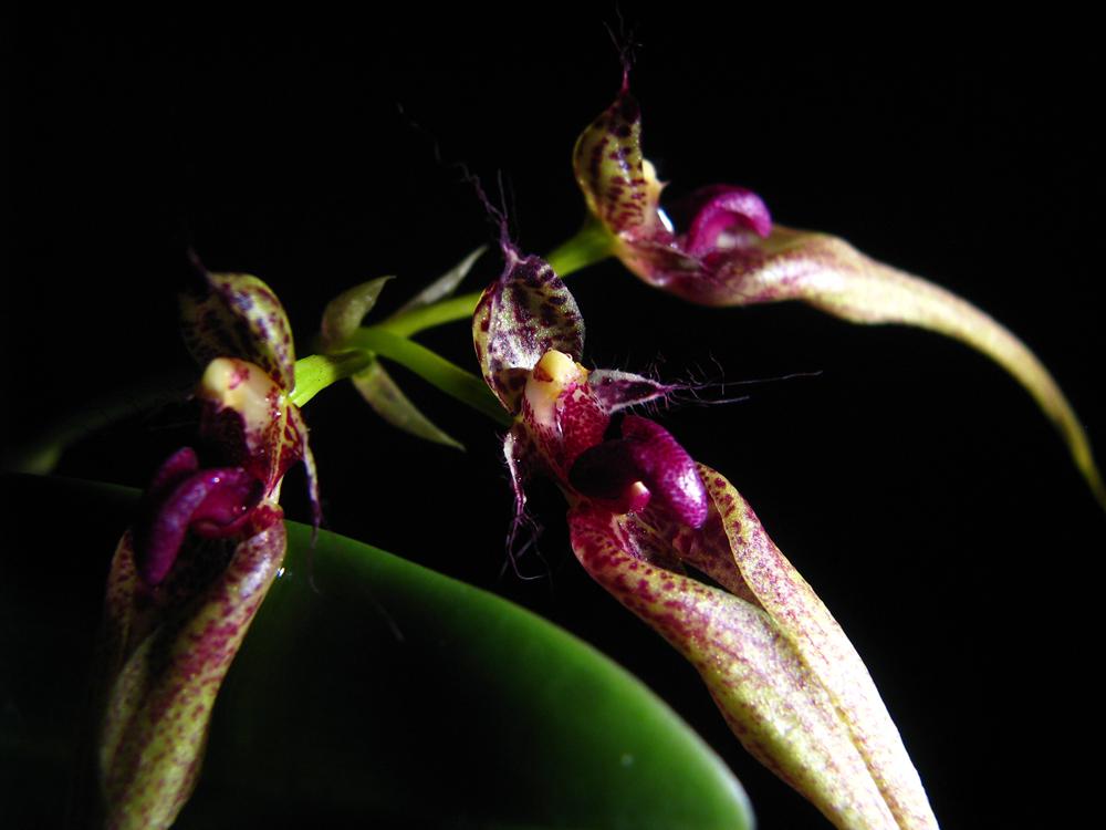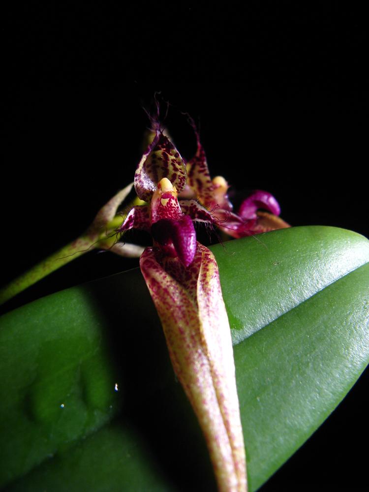 Moją roślinę nabyłam na listopadowej wystawie w Łodzi. Jako że chętnie wychodzi z doniczki, miała odłamaną jedną skrajną pseudobulwę z przysuszonym już zalążkiem pędu kwiatowego. Po jakimś czasie od zakupu posadziłam tę odłamaną pseudobulwę z kilkoma korzonkami na podkładce i umieściłam w orchidarium. Po paru dniach pęd kwiatowy ruszył ze wzrostem, choć wcześniej przez parę tygodni stał w miejscu. Nie liczyłam na kwitnienie, a tu taka miła niespodzianka, choć nie moja zasługa