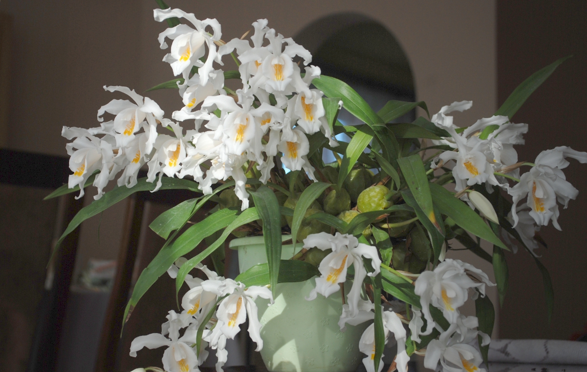 Około grudnia pokazały się zalążki pędów kwiatowych. Teraz kwitnie w pełnej krasie. Kwiaty mają około 5-7 cm średnicy i pachną.
