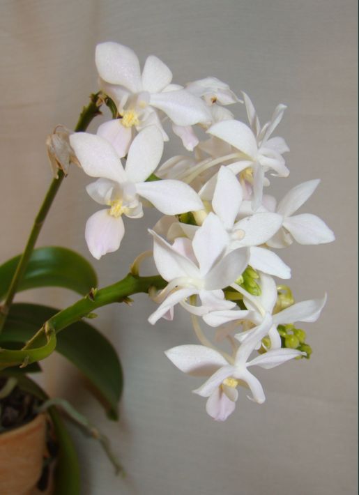 Szczerze powiem, kupiłam Ph. equestris z tego powodu, że polecany jest jako pierwszy storczyk botaniczny, by nauczyć się je uprawiać. Faktycznie tak jest. Denerwuje mnie jednak to, że pęd kwiatowy ciągle się przedłuża ( obecnie około 20 cm) a na jego szczycie dosłownie kilka malutkich kwiatuszków :shock: . sztuką jest doprowadzić do tego by na Ph. equestris była burza kwiatów ( a dla tego widoku go też zakupiłam). Póki co przy drugim kwitnieniu utrzymuje max. 9 kwiatów, zapach też niezbyt przyjemny, taki stęchły. Podobno ma skłonność do wytwarzania basal keiki...ale mój jakoś nie . Póki co traktuję go jako ćwiczenie. Storczyki zaskakują i to w nich jest wspaniałe, więc może i equestris mnie czymś zaskoczy.Jednak widzę, że odmiana var.alba jest bardziej skora do intensywniejszego kwitnienia.