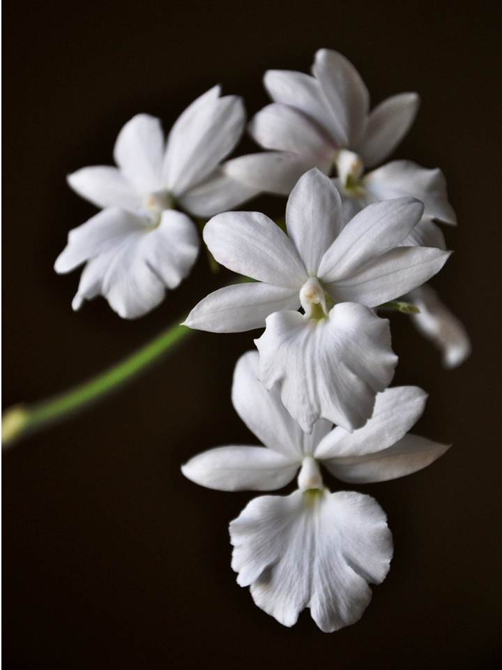 Przed chwilą sprawdziłam, pchałam nochal do środka i nic, nijak nie wyczuwam zapachu Nie wiem, czy jest go pozbawiony, czy ja mam niedoskonały narząd powonienia Ale za to odkryłam, że ma ostrogę, wcześniej jej nie zauważyłam. Krystaliczna biel, "mechatość" i ostroga, wybaczam ewentualny brak zapachu. A przy okazji podaję, że kwiatuszek owszem jest subtelnej urody, ale rozmiar ma całkiem słuszny, prawie 7 cm.