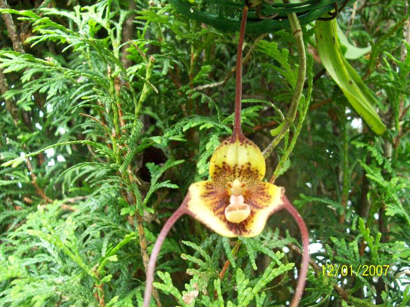 Kwiat tej Dracula jest oryginalny,lekko "kudłaty",ma zaledwie 2,5 cm dł.nie licząc ogonków.Warżka jest jakby ruchoma.Drży przy najmniejszym podmuchu wiatru.Może straszy?