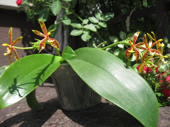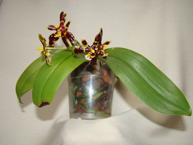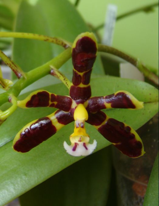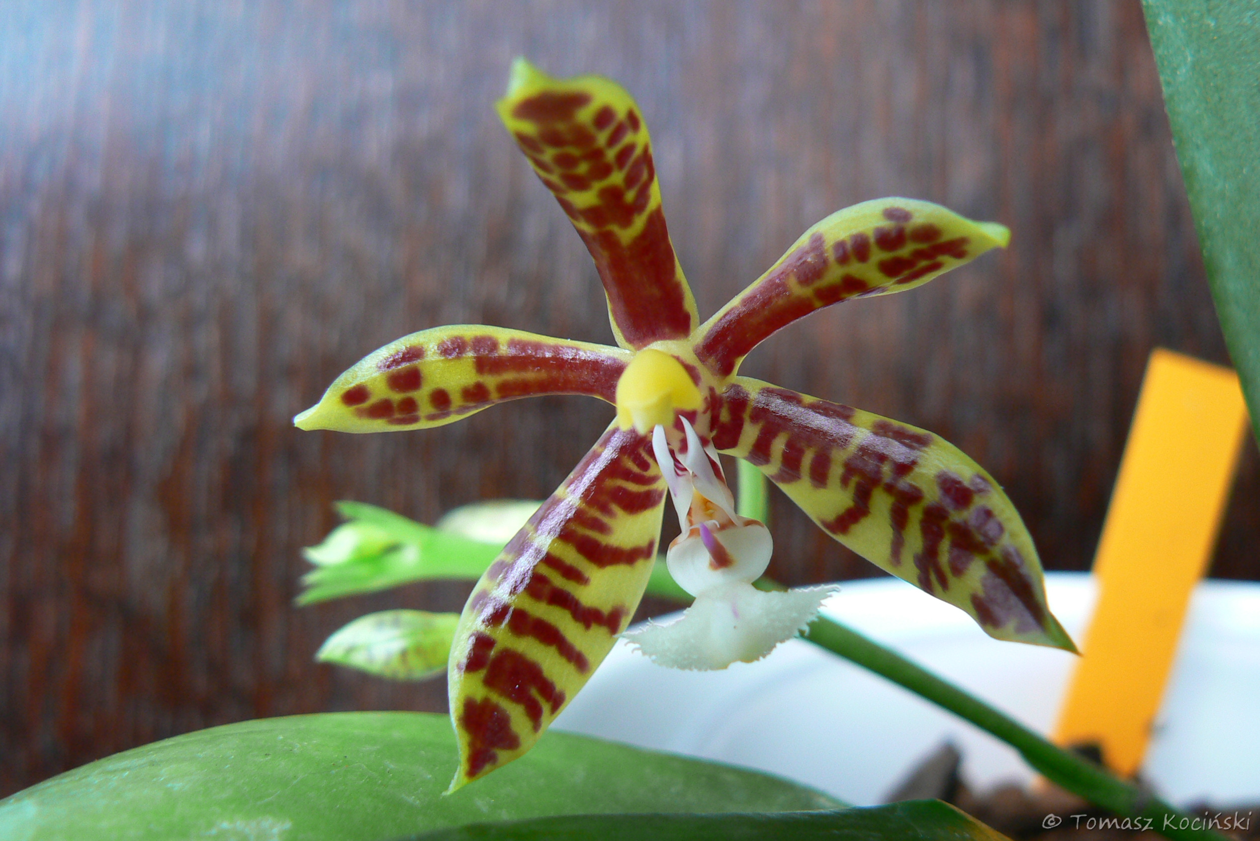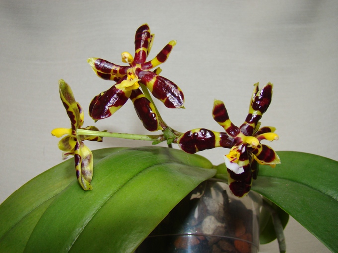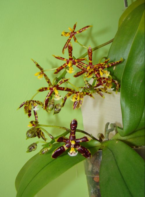 Popularna phalaenopsis , łatwa w uprawie , niedużych rozmiarów . Roślinkę mam jakieś dwa lata , kwitnie u mnie pierwszy raz . Kwiaty drobne , choć dość trwałe , woskowe , błyszczące , nie wyczuwam zapachu . Uprawiam ją na parapecie wschodnim , słonecznym , podłoże klasyczne do storczyków , ma ciepło cały sezon ale wilgotność trochę za niska , pewnie nie przekracza 40% (to u mnie największy problem)