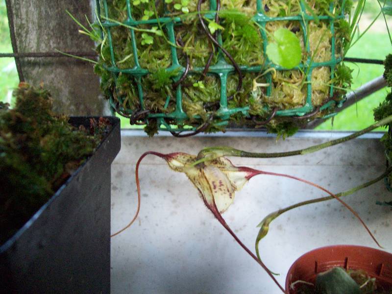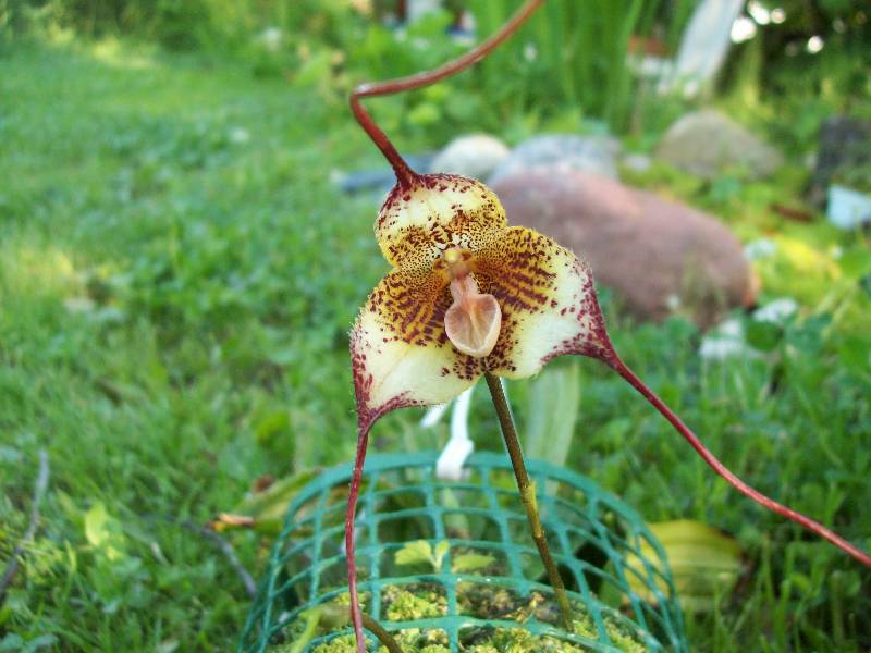 Przyjechała ponad trzy lata temu z Ekwadoru.Zaaklimatyzowała się tak,że znosi i chłody, i upały przy tym rosnąc i kwitnąc,co zaczyna z końcem wiosny.Uważam,że należy do najpiękniejszych drakuli,chociaż kwiat ma tylko 3 cm wysokości,16 cm z ogonkami.