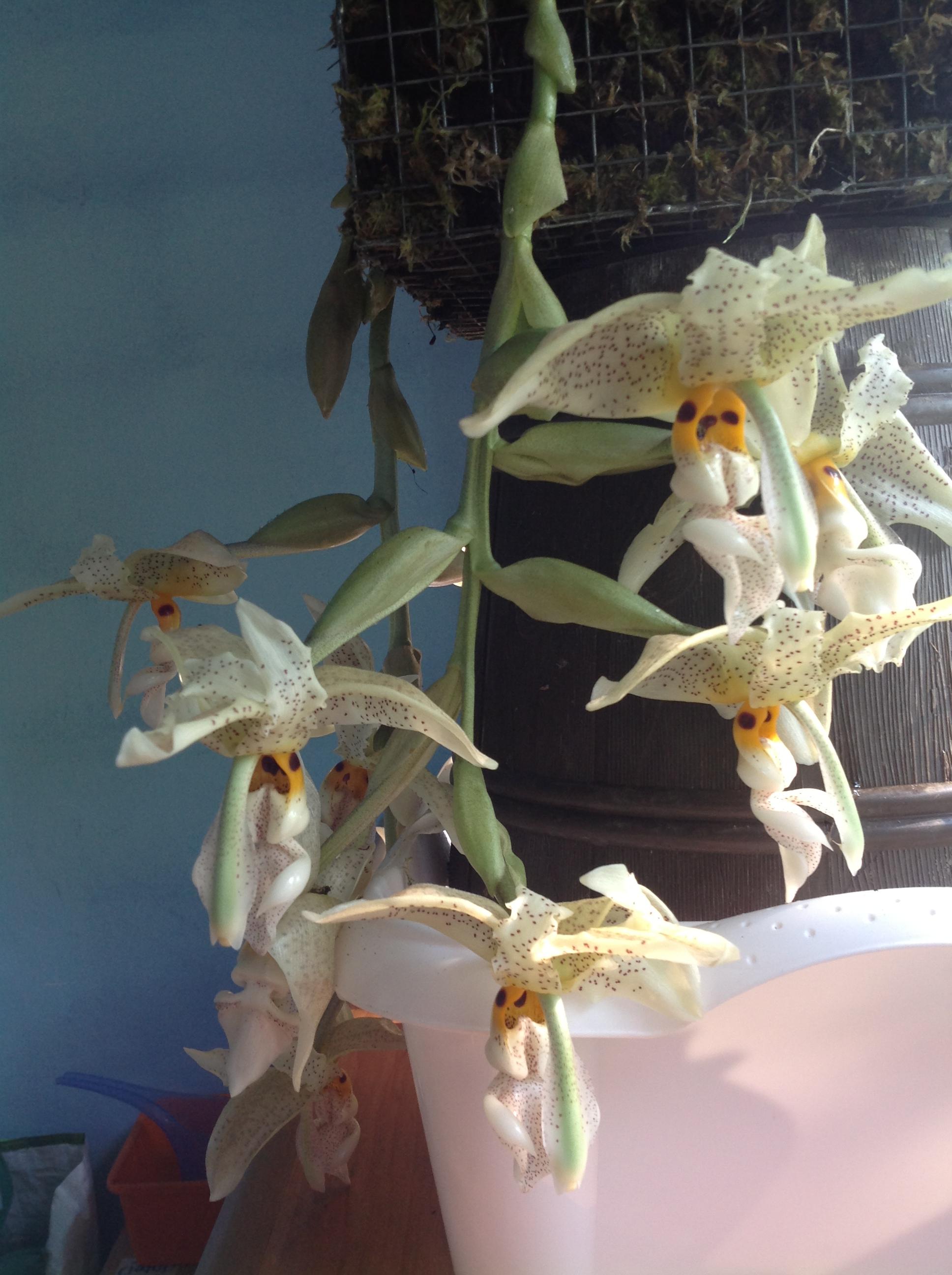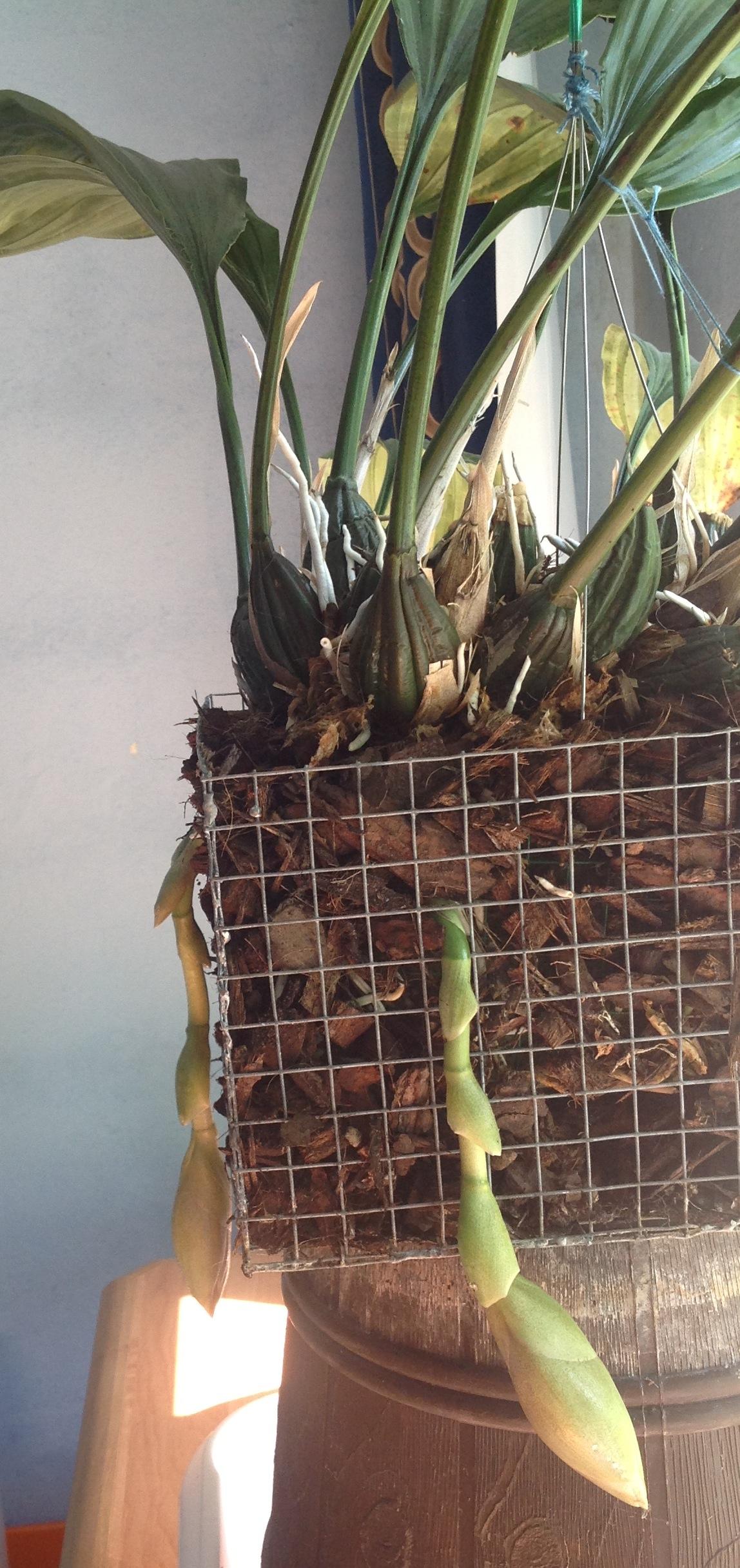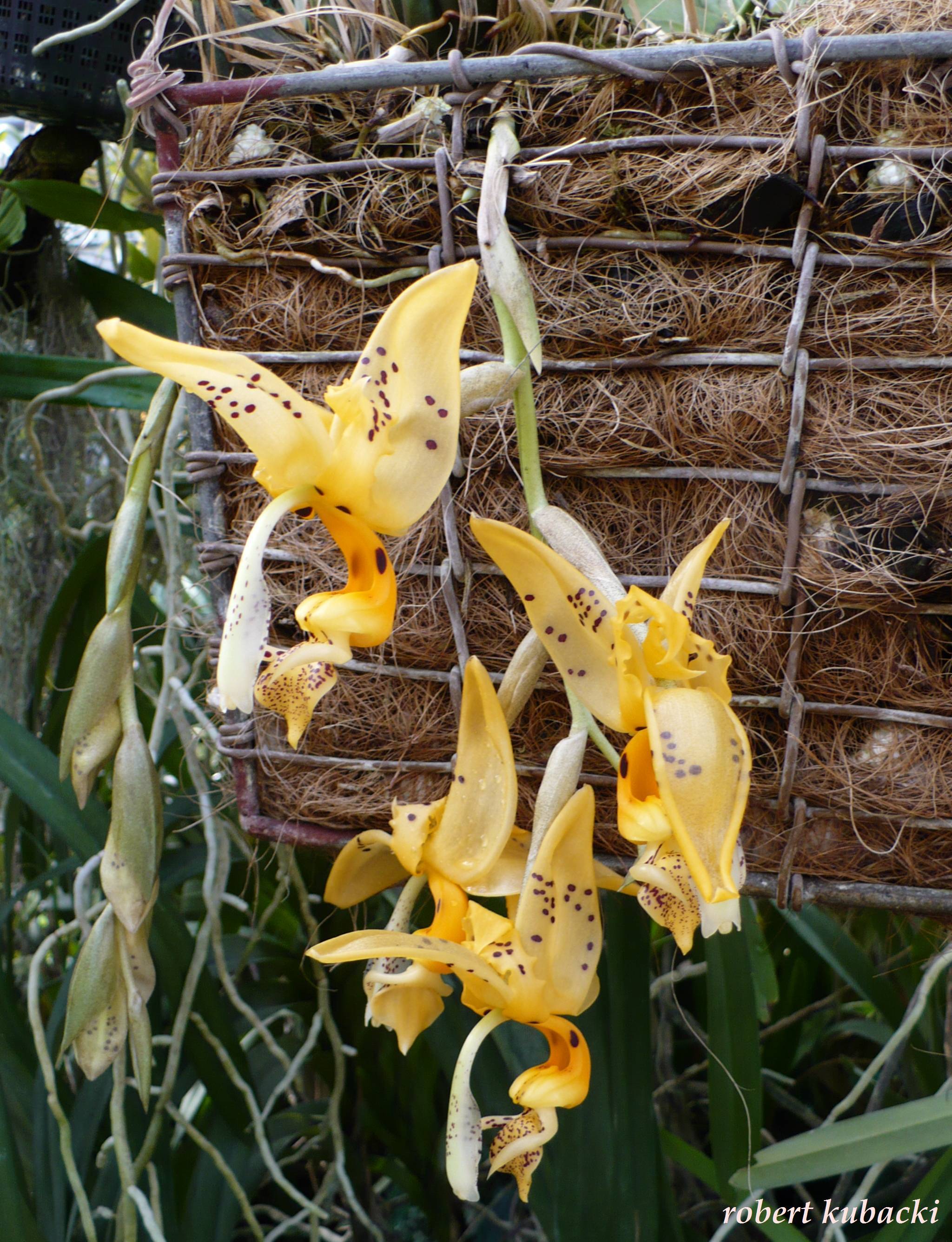 Teraz o uprawie: nigdy nie poświęcałem tej roślinie szczególnej uwagi. Podłoże to sama kora, koszyk wymoszczony jest torfowcem. Nawożę dość obficie różnymi nawozami do storczyków, zależy, jaki nawinie mi się pod rękę. Nie wolno rośliny przesuszyć, bo wtedy na liściach pojawiają się szpecące plamy (choroba fizjologiczna). Jeśli chodzi o temperatury, to jest raczej chłodno-latem maks. 25 st. C, zimą nawet 10. W 2010 Stanhopea postanowiła zwiększyć masę, wytwarzając 7 pseudobulw, kwitnienia się jednak nie doczekałem. Cykl ich wzrostu i dojrzewania jest powolny-mam nadzieję, że w tym roku zostanę zaszczycony chociaż jednym pędem kwiatostanowym. Pozdrawiam i polecam tą bezproblemową roślinę (choć rozmiary ma słuszne-liść z ogonkiem dochodzi do 70 cm)-Michał