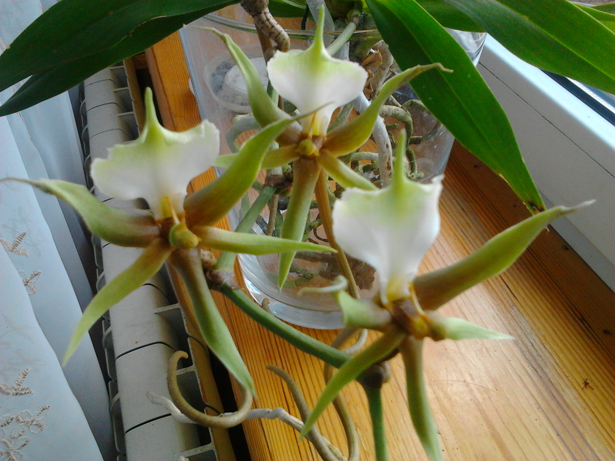Tę roślinę uprawiam jak Vandy,czyli bez podłoża w szklanym wazonie,namaczam co 2-3 dni,nalewam wodę do wazonu, a po 1-2 wylewam.Korzenie są w dobrej kondycji.