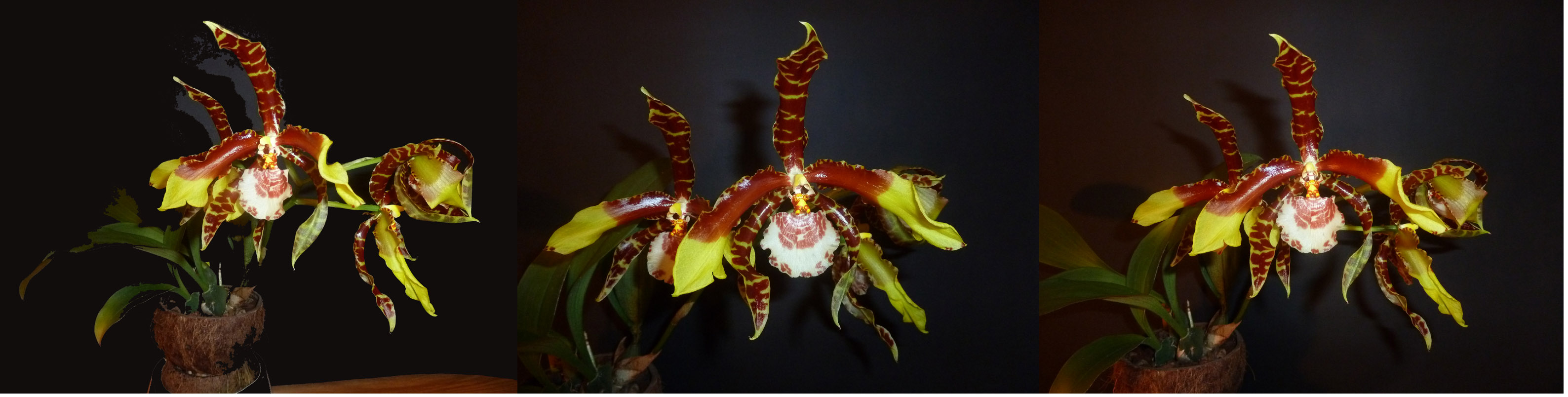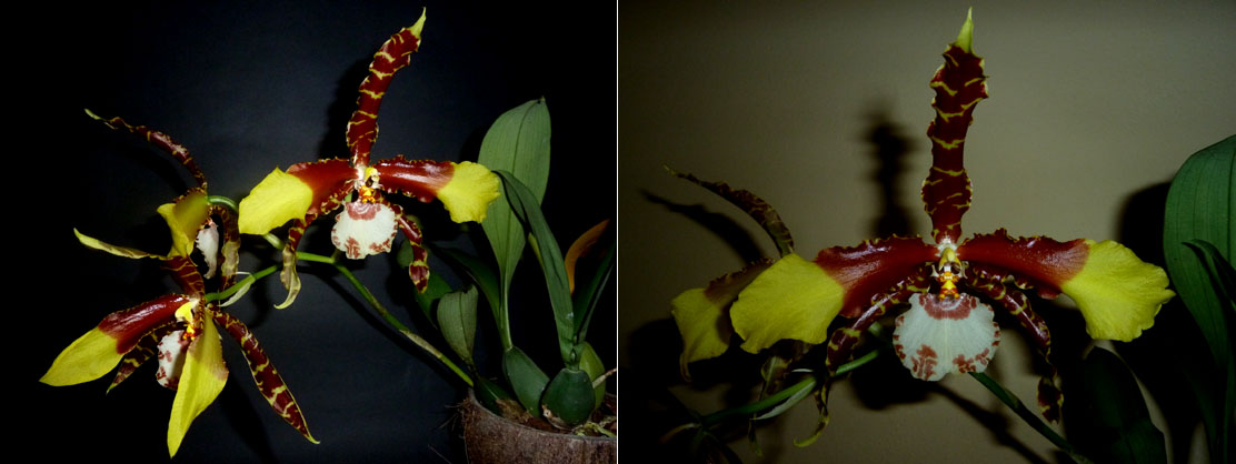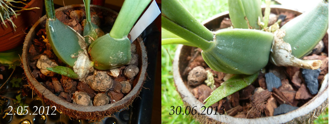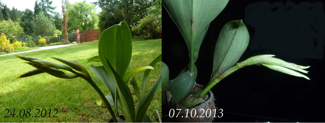 Wiedzę na temat uprawy miałem żadną, a doświadczenia hobbystyczne podobne. Starałem się zapewniać w okresie kwiecień - październik warunki zbliżone do Phalaenopsis, natomiast zimą roślina przebywała w niższych temperaturach, z bardzo oszczędnym podlewaniem głównie sprowadzającym się do zraszania pseudobulw. W efekcie corocznie przybywał jeden nowy przyrost, ale kwitnienia jak na lekarstwo. Po istotnej zmianie warunków uprawy – od połowy maja storczyk zamieszkał pod świerkami i był poddawany warunkom panującym na dworze. I czym to skutkowało?