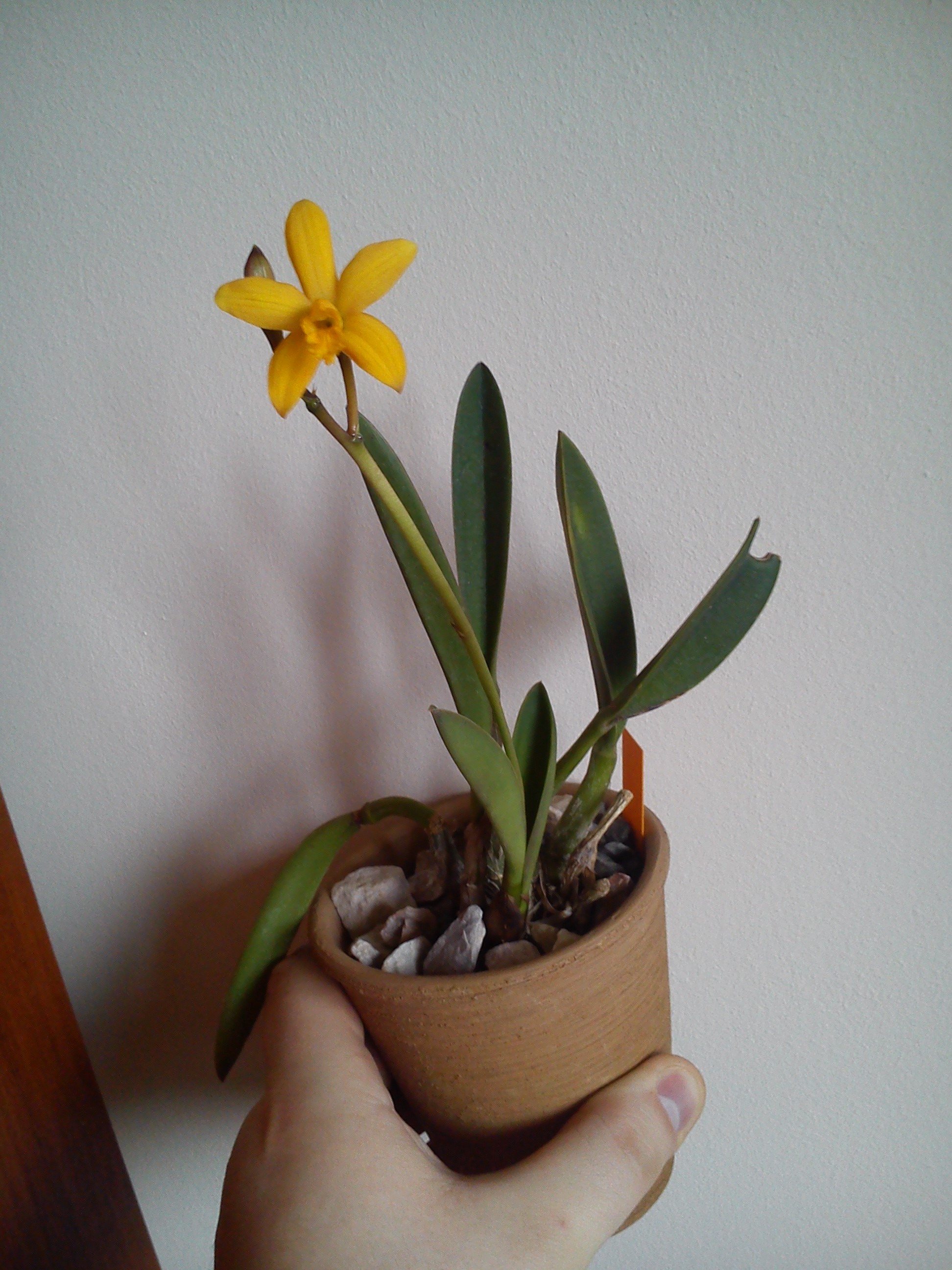 Witam. Chciałem zaprezentować pierwsze kwitnienie nabytej ok rok temu rośliny. Laelia ' Seagull' jest krzyżówką Laelii milleri x Laelii briegeri. Uprawiam tę roślinę tak jak zaleca się w przypadku litofitów czyli w podłożu z okruchów skalnych, w ceramicznej doniczce która szybko wysycha. Jest to pierwsza moja Laelia z tej grupy. Uprawiam ją na parapecie zachodniego okna jak najbliżej szyby ( maksimum światła ), latem w ogrodzie miejscu gdzie ma pełne słońce do godziny ok 13-14. Wiosną i latem podlewam lub zmgławiam dość często, zimą trzymam bardzo sucho ( okazjonalne lekkie zmgławianie ) i maksimum światła. Moja Laelia w styczniu zaczęła wypuszczać pęd kwiatowy więc podlewałem ją częściej. Wczoraj zakwitła pierwszym kwiatem. Kwiat jest niewielki, ok 3 cm intensywnie żółty.