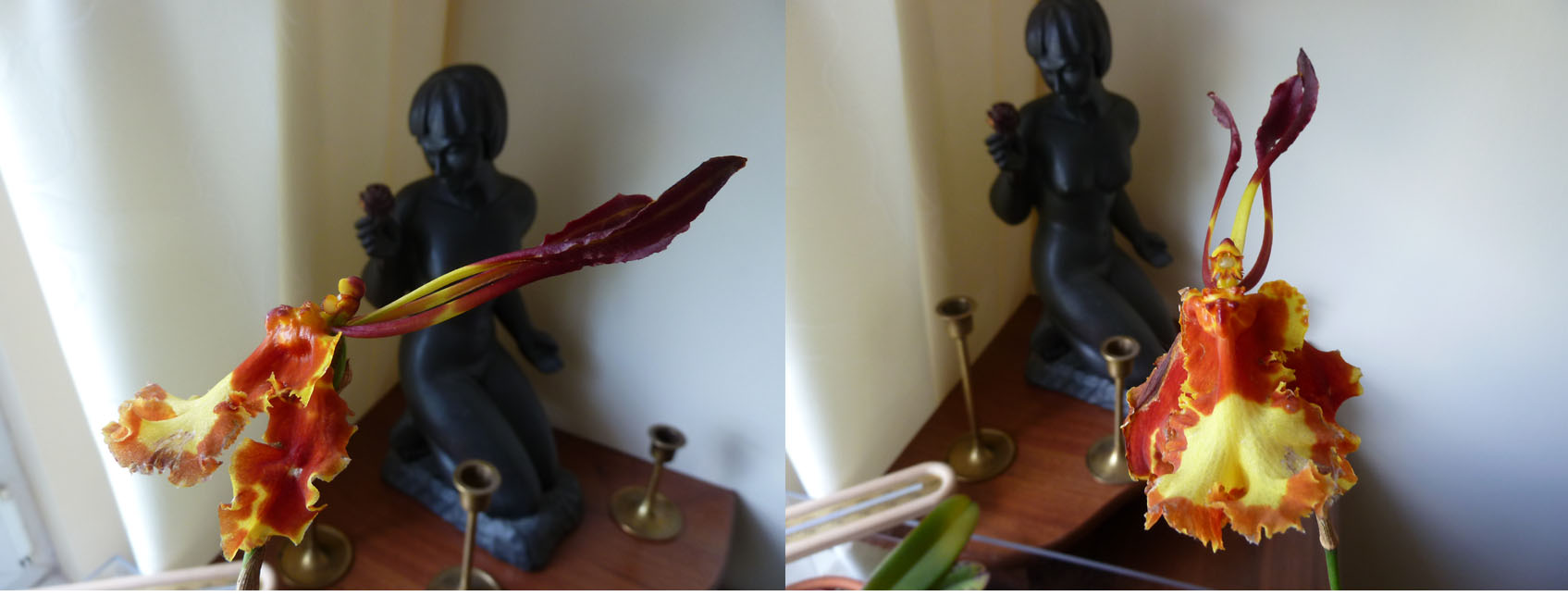 Teraz mam niedaleko, prawie kamieniem rzucić, 35 km. Zamówiłem internetowo hybrydę Psychopsis Mariposta Twins, ale wybrałem się osobiście po odbiór rośliny. Zaskoczyło mnie to, że zastałem ją kwitnącą, i to nie jedną jedyną. Było ich wiele, a to mój wybór -