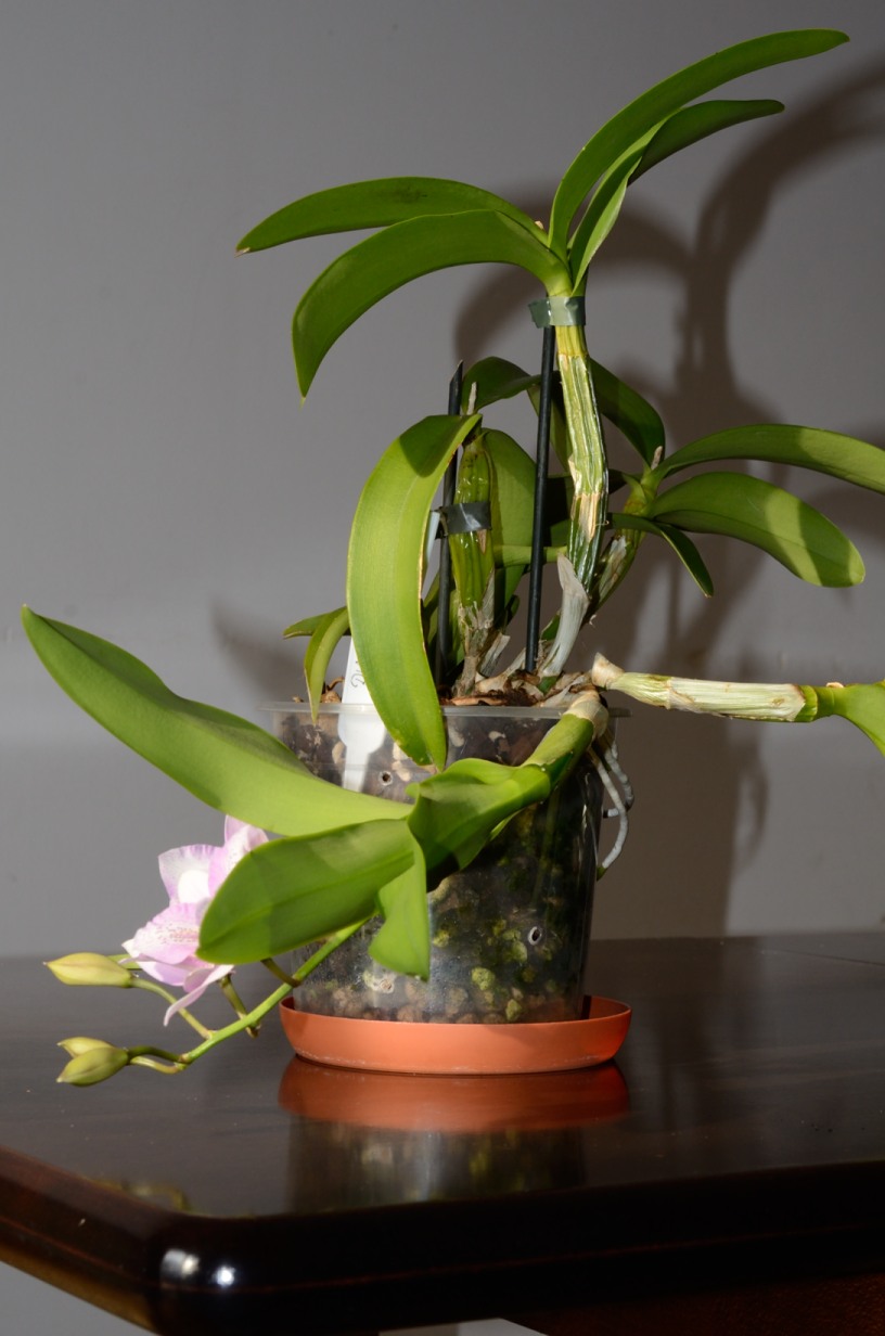 Dwa ostatnie przyrosty, dążąc najkrótszą drogą do światła, wyrosły mi w poziomie. Kilka korzonków najmłodszego wyszło poza doniczkę. Będę ją przesadzać, jak tylko skończy kwitnienie. A potem kombinować z ustawieniem doniczki na półce, żeby kolejna pseudobulwa poszła w pionie :D