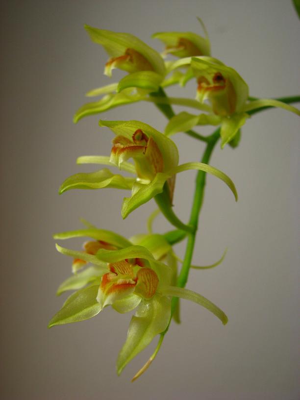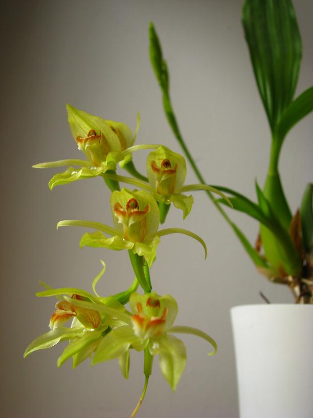 Kwitnie u mnie tytułowa ceologyne. Roślinka kompaktowa, niekłopotliwa w uprawie. Uprawiam ją od młodej roślinki chyba od 3 lat. Stoi sobie w ciasnym kącie północnego parapetu w gąszczu sabotków, troszkę zapomniana, a przez to nie zawsze podlewana wystarczająco często W tym roku mile zaskoczyła dwoma pędami kwiatowymi. Wcześniej w orchidarium kwitnąć nie chciała. Kwiat około 4cm.