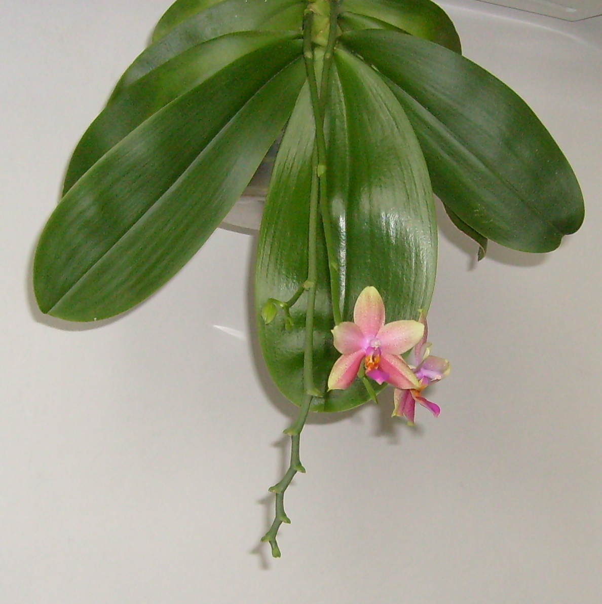 Tak,dwa pączki są na nowym pędzie i dwa na odgałęzieniu starego.Jak rozwinie się więcej kwiatów,spróbuję zrobić ładniejsze zdjęcie.Mam nadzieję,że uda Ci się rozmnożyć twojego kwiatka.Dalsze losy mojego stoją niestety pod znakiem zapytania.Pisałam o nim na 'starym' forum (Wirus na Phalaenopsis Liodoro).Pomimo podejrzenia choroby wirusowej,rośnie, wypuścił piękny,szeroooki liść no i kwitnie.Mam nadzieję,że nie jest to jego 'łabędzi śpiew'.Do rozmnażania już się nie nadaje.W najgorszym razie kupię następnego,bo to wspaniała krzyżówka.