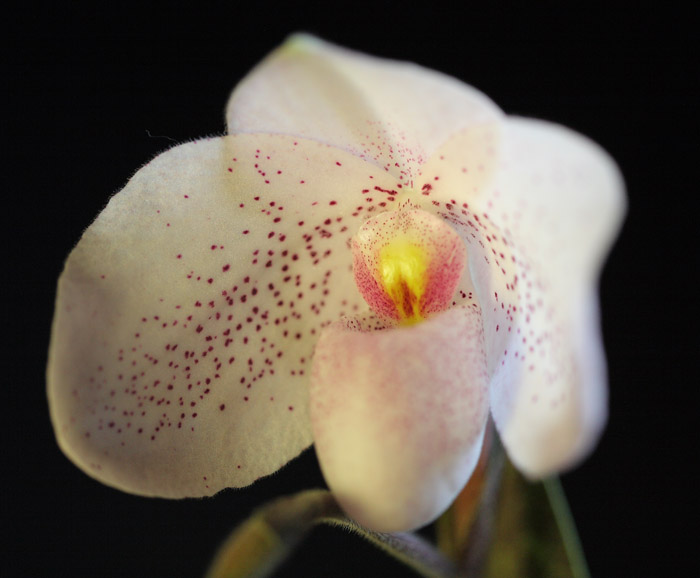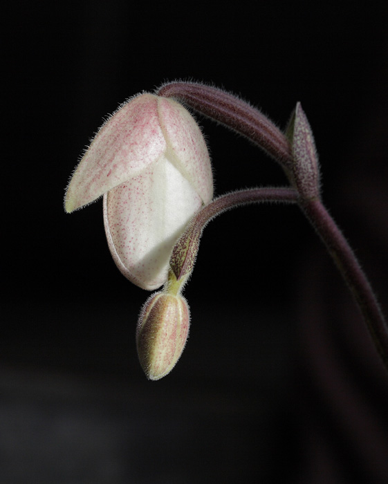 Paphiopedilum Vanda M Pearmen to uroczy, bezproblemowy storczyk. Jego "rodzice" to Paph. bellatulum i Paph. delenati.