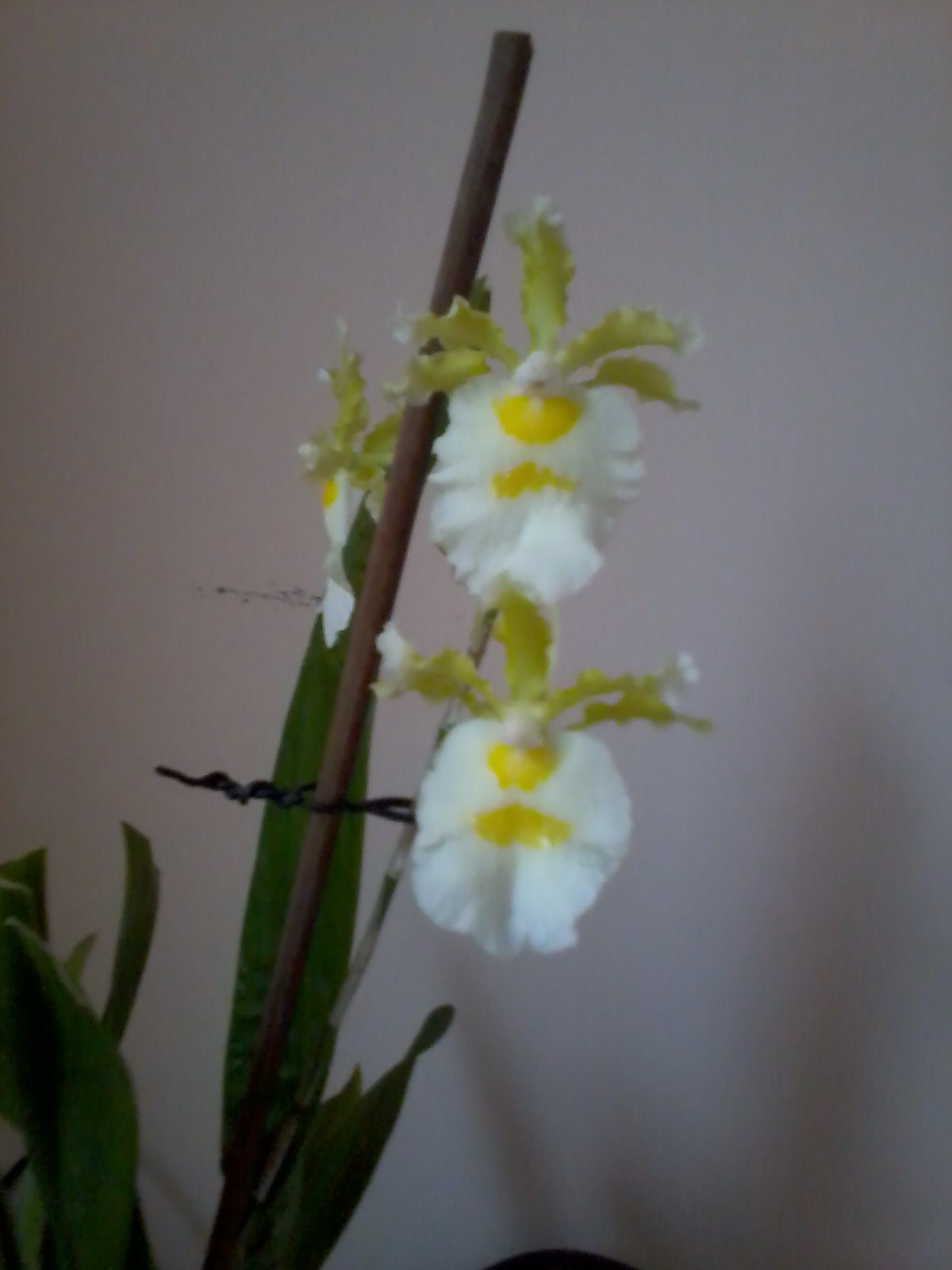 Roślina znana również pod nazwą Miltonia warscewiczii alba, choć według mnie niewiele ma wspólnego z tym rodzajem Storczyka tego mam od niedawna (od ok. miesiąca), dotarł do mnie już z pędem kwiatostanowym, ale kwiaty i pąki rozwinęły się u mnie. Niewiele na razie napiszę poza tym, że ślimak zeżarł wszystkie młode korzenie Na jego nieszczęście został przyłapany na gorącym uczynku i poddany eksterminacji. Za jakiś czas napiszę, jak roślina sobie u mnie radzi. Kwiaty mają ok. 5 cm średnicy i pachną w specyficzny sposób.