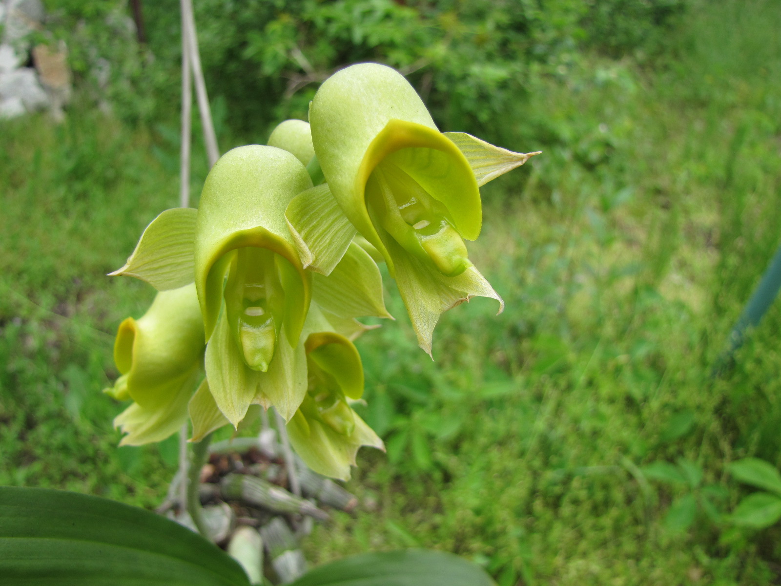 Kupiłem go w fimie niemieckiej jako catasetum sp., czyli nie wiadomo dokładnie co. Identyfikacja okazała się dość prosta, choć podobne kwiaty ma catasetum macrocarpum, ale ono kwitnie na jesieni. Natomiast charakterystyczny jest zapach tych kwiatów, pachną przyjemnie olejkiem z lukrecji.