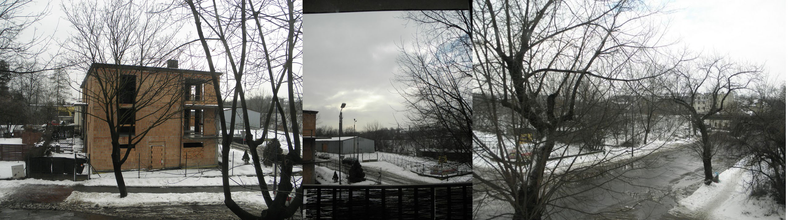 Zaczynając od lewej mamy widok z okna 1 - powierzchnia szyby 1.31 m2, następnie ogląd z okna 2 o powierzchni 2.34 m2 i ostatni obrazek to spojrzenie z okna 3 - powierzchnia szyby 1.31 m2.