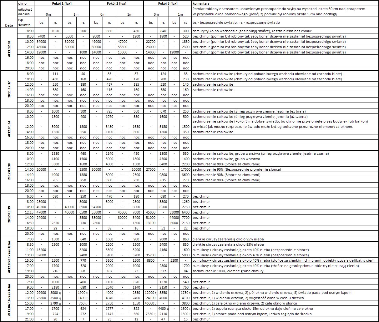 Wszystkie pomiary były przeprowadzane w krakowskim mieszkaniu, czyli jest to południowa część naszego kraju. Bez wątpienia na północy różnice w nasłonecznieniu byłyby zauważalne, choćby długość dania jest różna. Na północy wiosną i latem dzień jest dłuższy za to jesienią i zimą jest krótszy niż na południu. W wyniku rozciągłości południkowej latem dzień nad Bałtykiem jest, w przybliżeniu, o godzinę dłuższy niż w Karpatach, zimą natomiast o godzinę krótszy. Dodatkowo, słońce w momencie górowania w południowych rejonach będzie zawsze wyżej, niezależnie od pory roku. Inny problem występuje przy zachmurzeniu. Pomiary robione przy zachmurzeniu nie uwzględniają grubości i ilości warstw chmur. W komentarzu do pomiarów próbowałem dodać opis moich subiektywnych odczuć na temat rodzaju zachmurzenia, dlatego pojawiają się tam takie informacje jak: chmury ciemne ołowiane, chmury białe, cumulusy, cirrusy i takie tam. Oczywiście jest to uszczerbek, który dyskwalifikuje te dane w sensie konkretnych liczb, ale to nie powinien być problem, bo te pomiary nie temu miały służyć. Poza tym wszystkie inne pomiary, również te w pełnym słońcu, są pod względem konkretnych liczb mało użyteczne, bo odnoszą się tylko do mojego mieszkania. Ale to nie problem, bo cała akcja miała tylko unaocznić różnice oświetlenia w funkcji zmian warunków zewnętrznych. A okazuje się, że byle daszek drzewko czy nawet kolor podłoża za oknem ma spory wpływ na ilość światła, które dociera do naszych okien. Chciałbym też zaznaczyć, że nikt nie dostanie gotowej wskazówki co do odpowiedniego okna czy wystawy dla swojej rośliny. Opracowanie ma tylko zasygnalizować pewne czynniki, które mają znaczący wpływ na ilość światła i próbuje procentowo określić tenże wpływ. Nic ponad to.