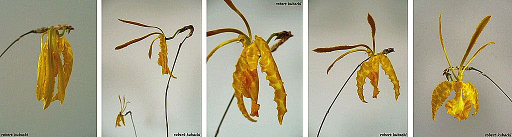 Pęd kwiatowy, wyprostowany, zwrócony w stronę światła, o długości około 70 cm (cały czas rośnie), wyrasta u podstawy najmłodszej pseudobulwy.