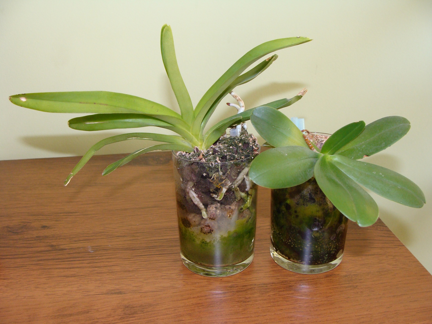 Na zakończenie, zdjęcia dwóch Phalaenopsis, posadzonych w doniczkach o trochę bardziej nietypowym kształcie (wysoka szklanka i szklany świecznik Rys. X.5).