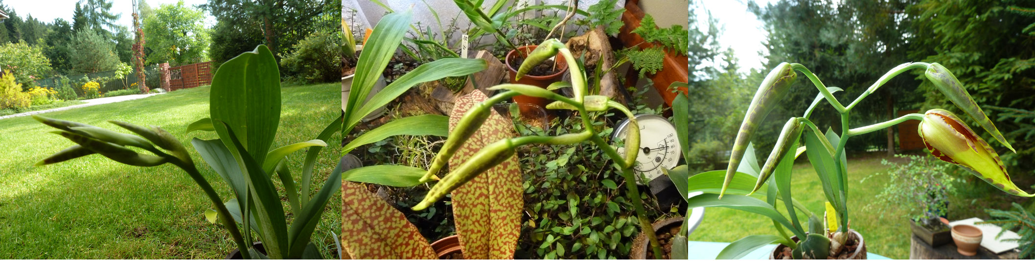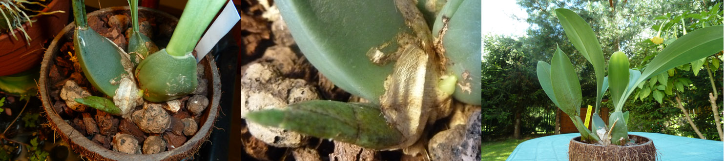 U schyłku kwietnia spostrzegłem nowy przyrost i po majowych przymrozkach roślina ‘wylądowała’ pod świerkami na dworze. Była poddawana dosyć częstym opadom i raczej niskiej temperaturze - D/N 16-24* / 8-16* C. przy wilgotności 70-90, a nawet okresowo 100 % . Podlewanie w zależności od opadów atmosferycznych (dbałem, by kokosowa doniczka była lekko wilgotna), natomiast podczas upalnej pogody zraszałem/zamgławiałem roślinkę rano i wieczorem, a czasem trzy cztery razy dziennie (podczas afrykańskich upałów). Nawożenie maj – ½ sierpnia , mniej więcej co dwa tygodnie z przewagą N- azotu, a od połowy sierpnia z przewagą P – fosforu.