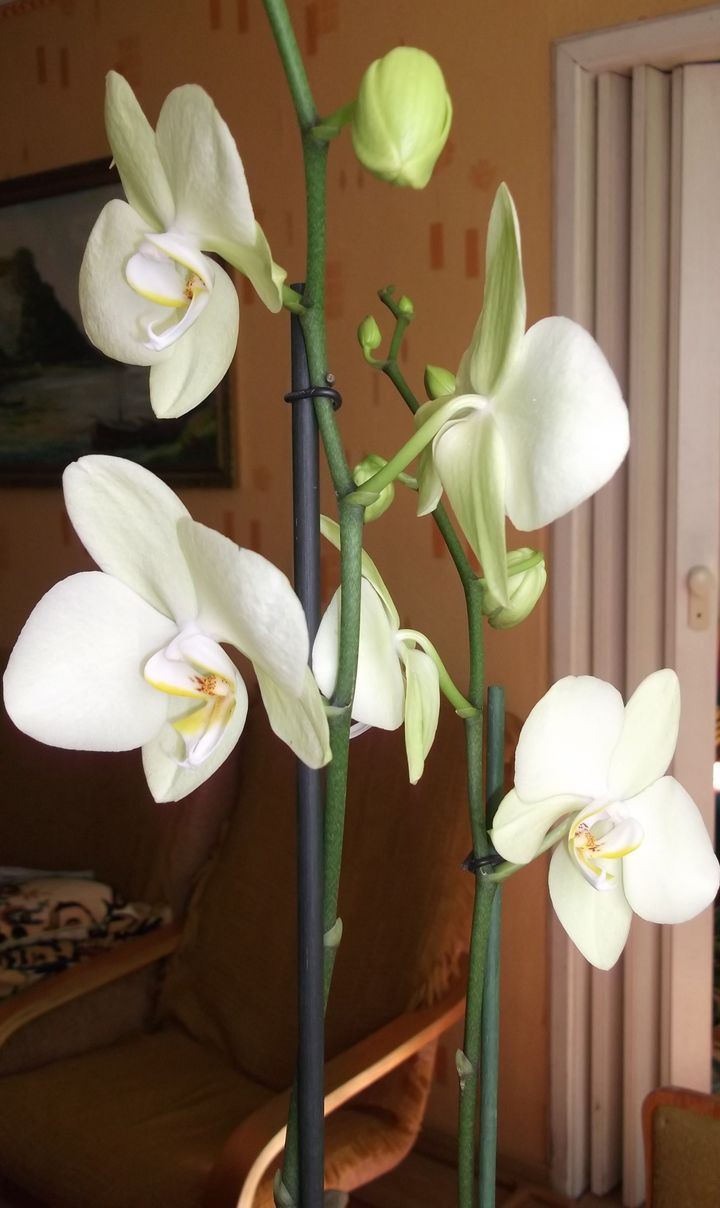 To jest mój trzeci w życiu storczyk ( pierwszy został poświęcony na cele naukowe , a drugi z przeceny mam na dzieję że dojdzie do siebie)tego kupiłam dziś na targach rolnych, myślę że to piękny okaz o lekko ni żółtych ni zielonych kwiatach. Wie ktoś może co to dokładnie za odmiana phal? bo śnieżnobiałe kwiaty to nie są i nie umiem dokładnie określić, czy to żółć czy zieleń