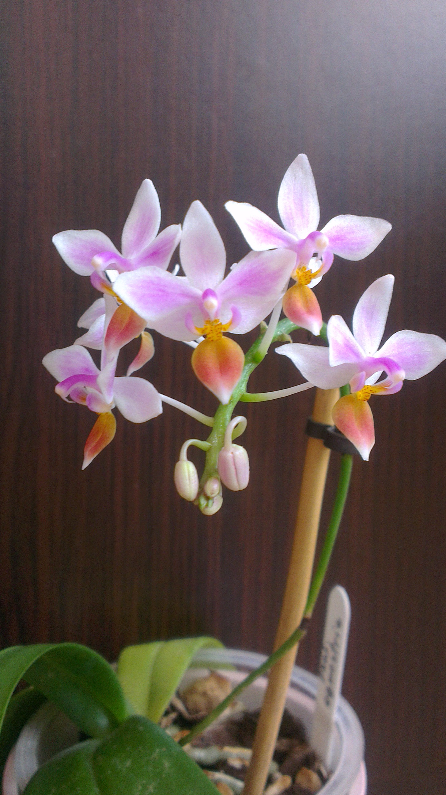 Dendrobium Nobile powtórzyło kwitnienie obfitsze niż wiosną, podobnie z Zygopetalum Rhein Blue Angel: rozwija pąki, pięknie pachnie żonkilami i ma 4 kwiatostany :D (nie zamieszczam fotek, bo się będą powtarzać), a poniżej pierwsze kwitnienie popularnej hybrydy (tu bez szału - 7 pąków i nadzieja na przedłużenie kwiatostanu)