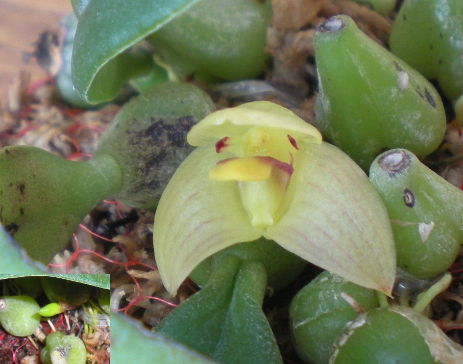 Trias oblonga. Mój aparat nie widzi kwiatka, za nic nie chce się na nim wykadrować, tylko na bulwach. Pewnie się mu nie podoba. Mnie też nie. Miał być picta :cry: