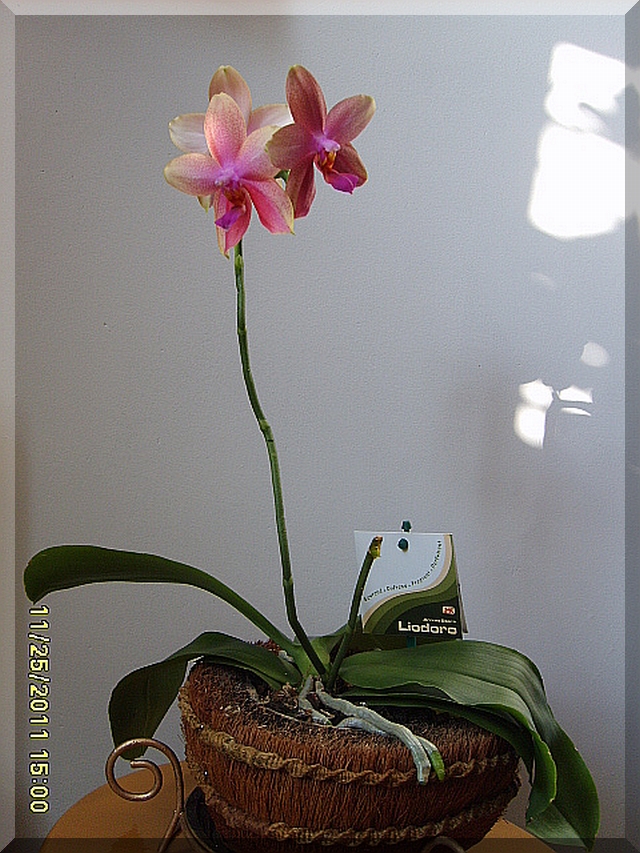 zainicjowanym u mnie. Uprawiam niewiele storczyków ze względu na bardzo ograniczone warunki mieszkaniowe, głównie marketowe hybrydy. Niestety sprawiają mi więcej kłopotów z kwitnieniem bezimienne mieszańce falenopsis, te zakwitają u mnie tylko raz w roku i to niezbyt obficie. Właśnie teraz większość z nich wypuszcza pędy i pąki. O tej porze roku, kiedy nawet przy moim zachodnim oknie naturalnego dobrego światła jest jak na lekarstwo, niewiele mogę zrobić, aby pędy rozwijały się i a pąki nie marniały :x . Na pocieszenie Liodoro nic nie robi sobie z pochmurnych dni i w listopadzie rozwinęło wszystkie swoje 3 pąki. Latem storczyk został przesadzony do zdobytego szczęśliwym trafem koszyka z kokosa. Roślina bardzo dobrze przyjęła się, wypuściła nowe korzenie, dorodny liść, a ostatnio i pęd. W piątek korzystając ze słonecznego popołudnia zrobiłam fotki, w pochmurne dni moim aparatem zdjęcia wyszłyby znacznie gorszej jakości.