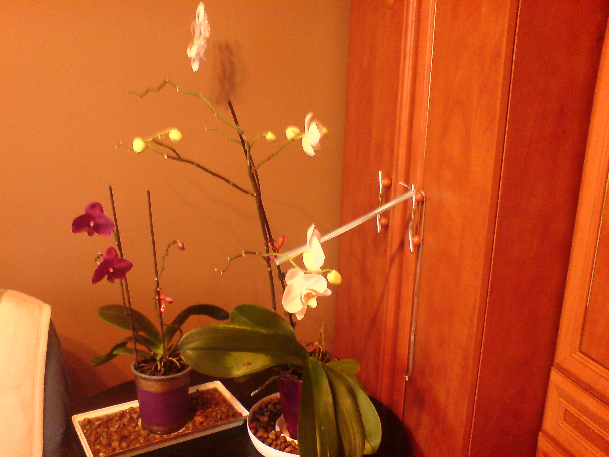 A wiec biały storczyk który zrzucił wszystkie kwiatki w czerwcu 2011 (łodyki pozostały zielone,nie obcinałam ich ), wypuszczał tylko liscie...do czasu kiedy postawiłam go na parepat (ciężko mi go ulokowć na nim bo jest duży :/ ) i dlatego też pączki wypuszcza tylko tam gdzie dochodzi światło.Pierwszego kwiatuszka rozwinął z tydzień temu