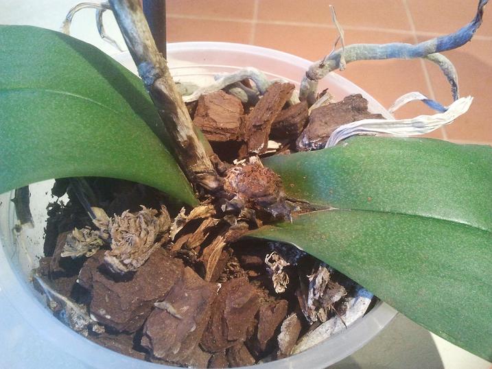 Moje storczyki przez pewien czas pozostały pod inna opieką niż moja.Niestety jeden z nich został kompletnie zalany łącznie ze stożkiem wzrostu.Roślina pomału umierała tzn. odpadały jej liście i została tylko z dwoma
