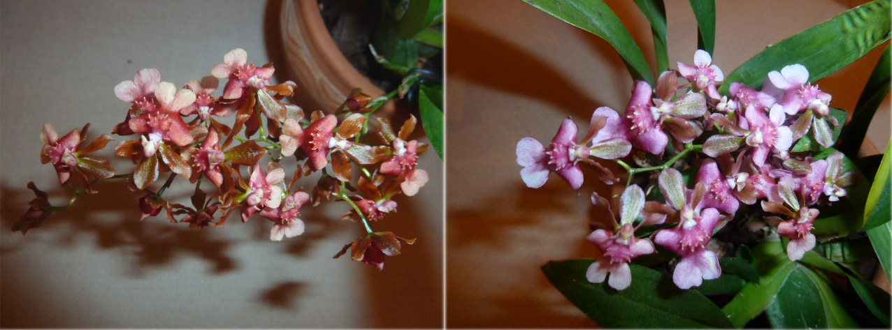 Ma bardzo cieniutkie korzonki, które na pewno są wrażliwe na zaleganie wody w doniczce więc namaczam na wyczucie. Liście oprócz harmonijek pod wpływem promieni słonecznych dostają nieestetycznych plamek co jest chyba jedynym minusem tej roślinki. A plusy? Jest na prawdę kompaktowa, pęd jest bardzo rozgałęziony i obsypany kwieciem, pachnie przyjemnie i delikatnie (na tą chwilę wyczuwam wanilię z jakąś inną nutą, ale nie potrafię jej nazwać). Pęd wydała od tak, nie mobilizowałam jej w żaden sposób. Wystawa południowa, stoi na stojaku przy oknie, więc nie paliły jej bezpośrednie promienie słoneczne, ale też miała ich pod dostatkiem. Namaczam na wyczucie, latem częściej, w okresie jesiennym rzadziej. Nawożenie bardzo nieregularnie i raczej skąpo. Nie pompuje w rośliny dużych dawek NPK, wyjątkiem jest żółta hybryda Oncidium (Oncidesa), którą nawożę wg porady Mery 3:1(3 namaczania z nawozem, czwarte czystą wodą).
