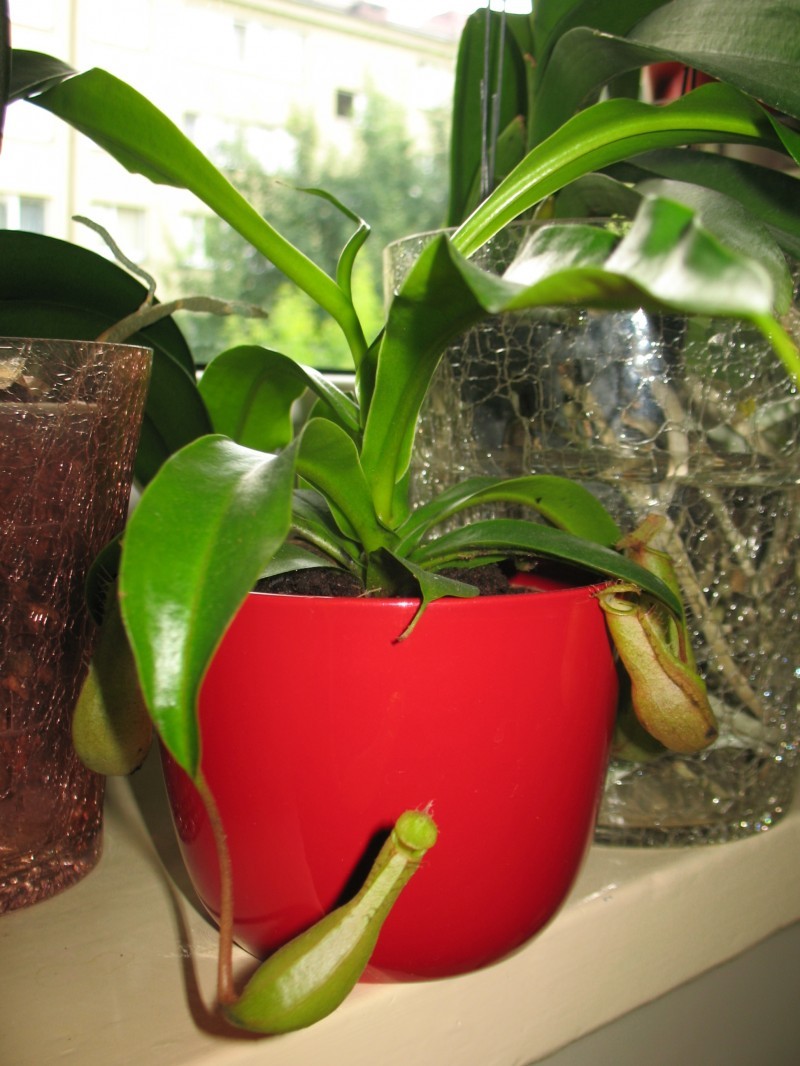 Dzbanecznik natomiast stoi w większej osłonce, prawie cały czas jest tam woda, poza tym spryskuję go bardzo często. W taki sposób chętnie rośnie na parapecie. Co jakiś czas jednak zawieszam go w małym akwarium, opisanym w innym wątku, tam bez problemu wykształcają się dzbanki-pułapki :D