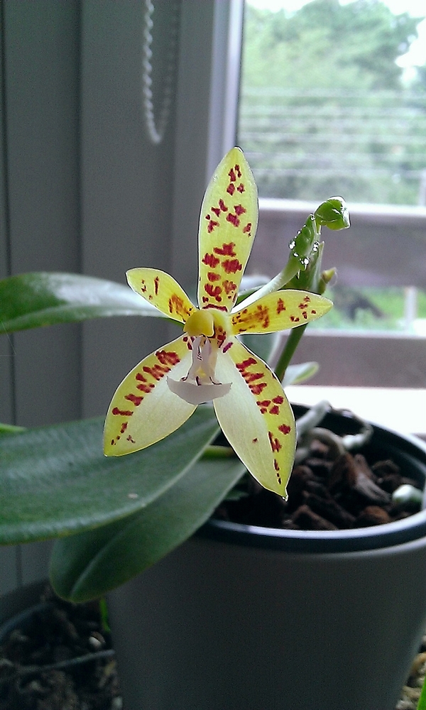 Zakupiony na tegorocznej wystawie w Warszawie jako nie kwitnąca roślinka. Na razie obdarzyła mnie jednym kwiatuszkiem, ale jest to kwitnienie które kosztowało mnie sporo nerwów - moje Phaleanopsisy zaatakowała jakaś choroba, i do końca nie wiedziałam, czy i tego nie dopadnie.