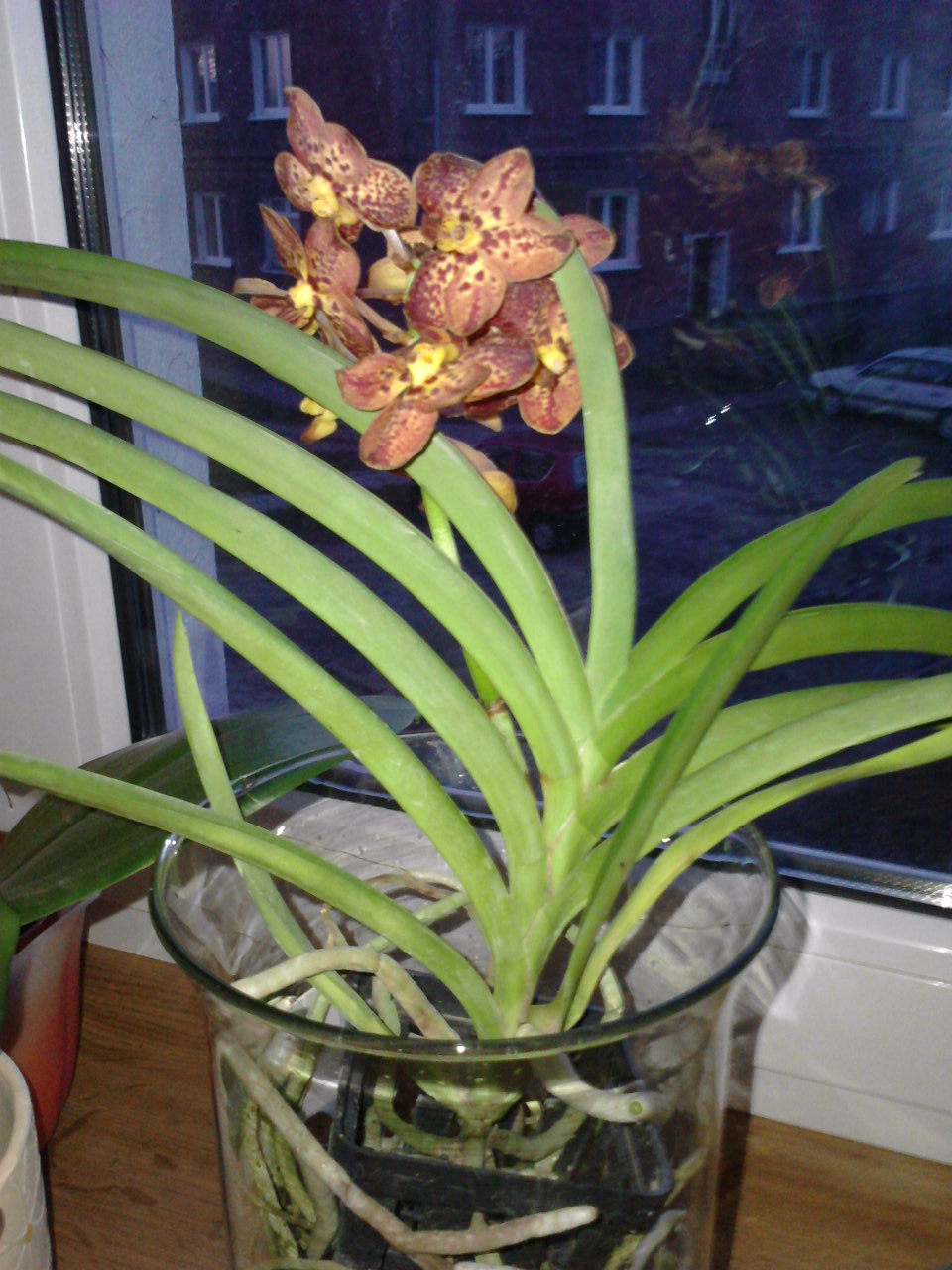 Śliczne vandy w kąpieli ,ja dopiero czekam aż moja zakwitnie, ale uważaj żeby nie moczyć ich podstawy bo mogą zagniwać, lepiej mniej wody (do moczenia) , a korzenie same ją pociągną.