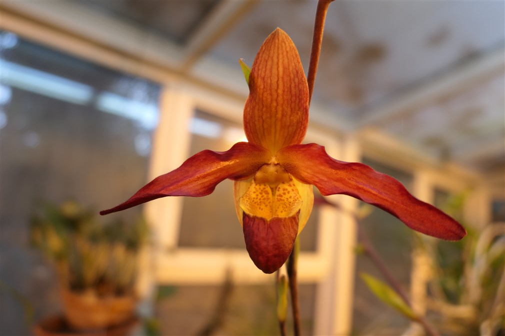 Phragmipedium Living Fire. Duża roślina, a więc na parapet nie za bardzo. Choć wszystkie Phragmipedium powinny rosnąć bezproblemowo. Podłoże raczej mało przewiewne. Zawsze mokro. Ja nawożę Osmocote.Na długim pędzie kwitnie kwiat za kwiatem po 5 -7 kwiatów.
