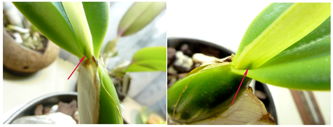 W ubiegłym roku (od początku marca 2013r.), gdy zaprzestałem doświetlania sodową lampą - HPS i dogrzewania roślin, warunki uprawy istotnie się zmieniły. Przede wszystkim obniżyła się temperatura o około 5-6*C., a także spadł poziom światła jakie mogłem zapewnić katlejce. Niskie temperatury spowodowały poważne uszkodzenie liścia na przyroście z 2012 r. (fotka poniżej), ale udało mi się zapobiec rozwojowi grzybków.