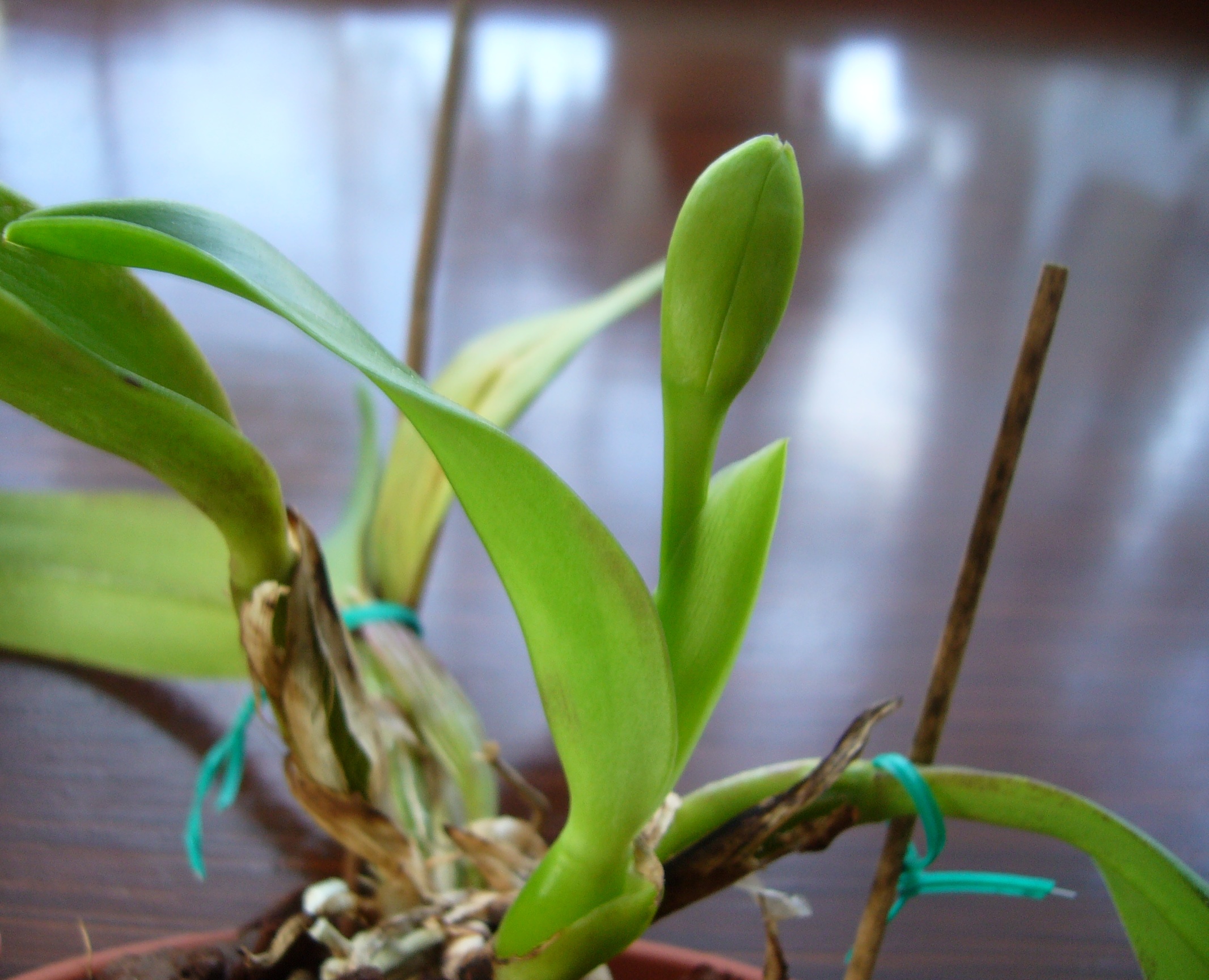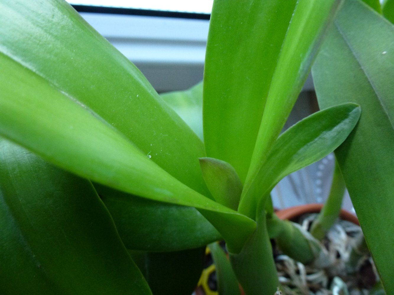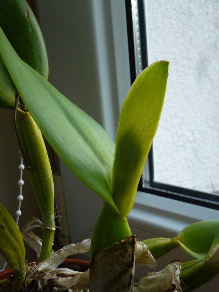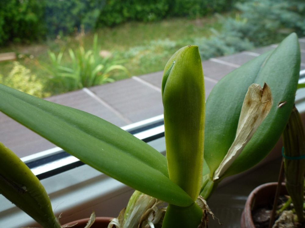 Przez zimę wyrósł kolejny przyrost z pochewką, niestety Cattleya nie zakwitła. Myślę, że psb nie była na tyle silna żeby wydać kwiat. Wiadomo brak odpowiedniego światła...Od lata urosła nowa psb z podwójną pochewką, coś tam widać, ale na razie jest jeszcze bardzo małe...